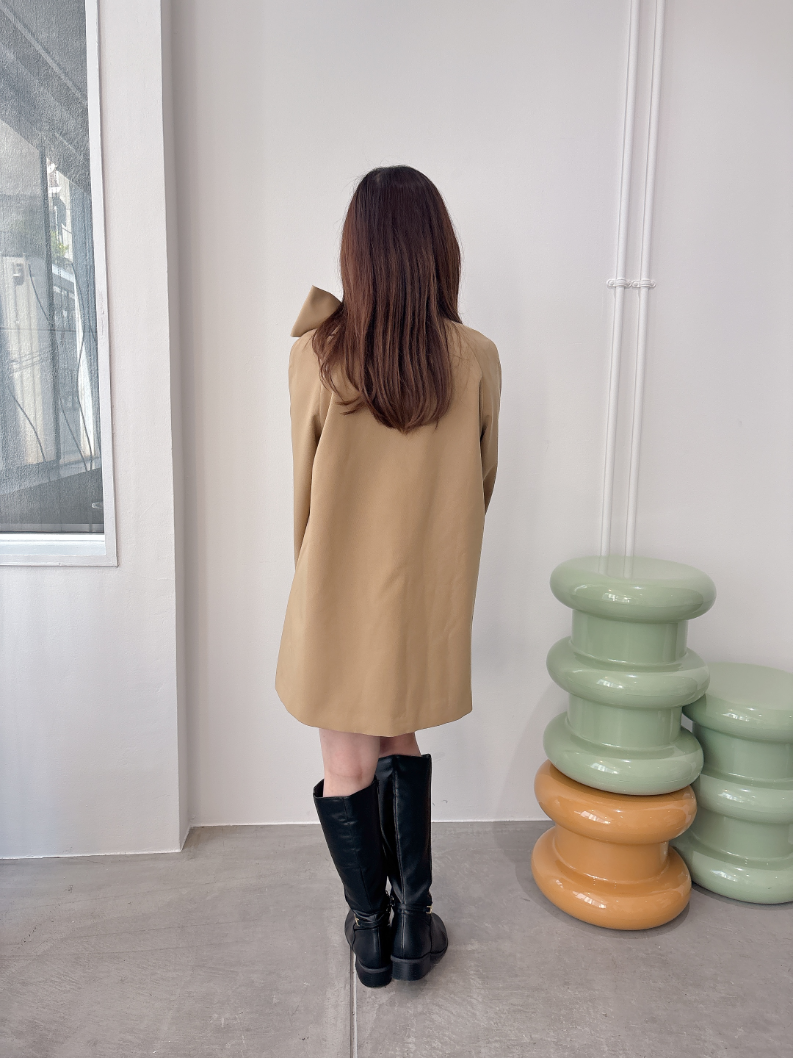 リボンはサイドで結びやすいよう設計されていますが、前でビッグリボンとして結んでも可愛く着ていただけます。襟元は上品なスタンドカラーデザイン。