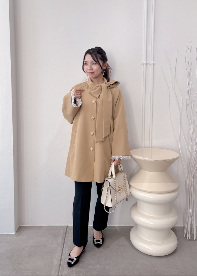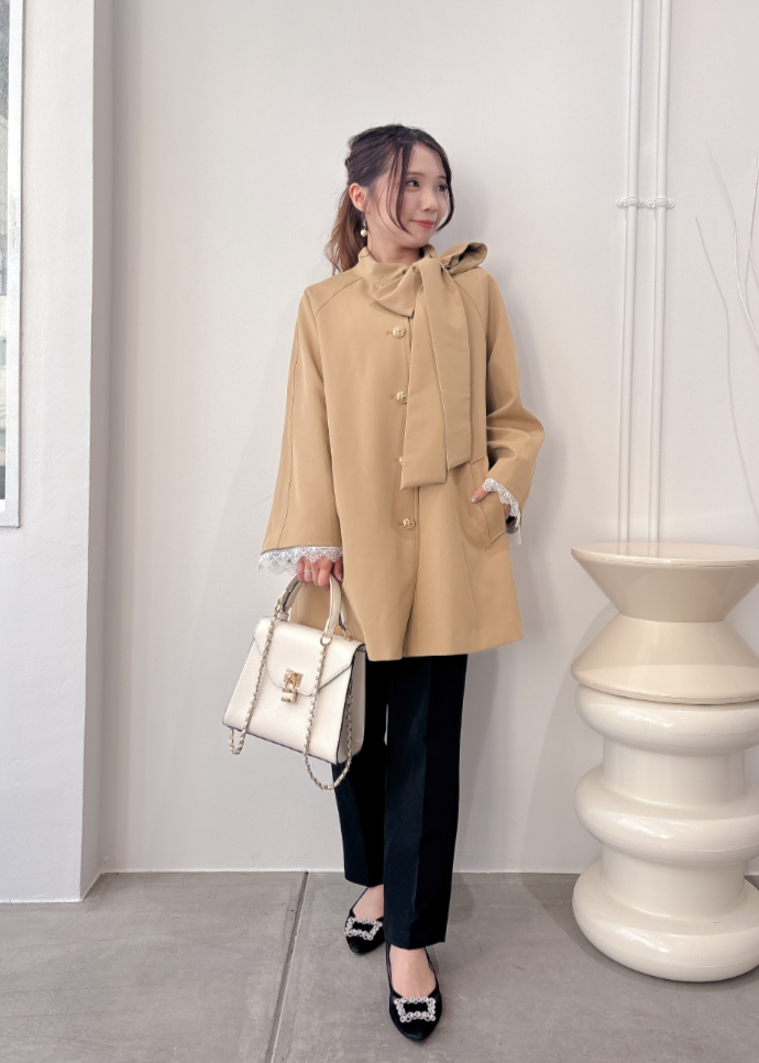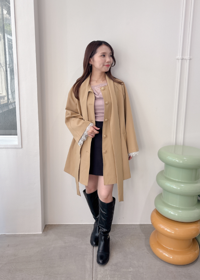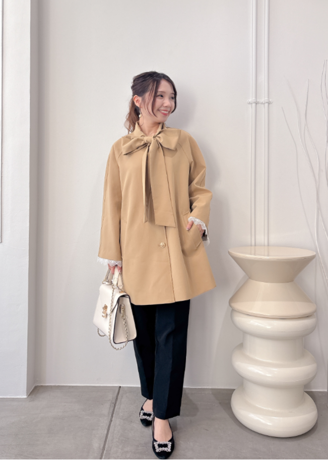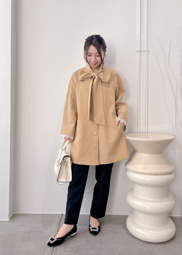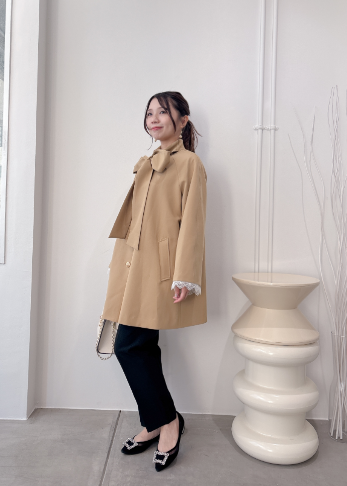 ミニボトムスに合わせるとトレンチワンピのように着れてsweetに♡テーパードパンツやタイトロングスカートに合わせると大人っぽく。合わせるアイテムによってがらっと印象が変わるので、かわいいものが好きな大人女性にこそぜひ選んで頂きたいなと思うアイテムとなりました。着やすいベージュカラーなのでお仕事にも〇