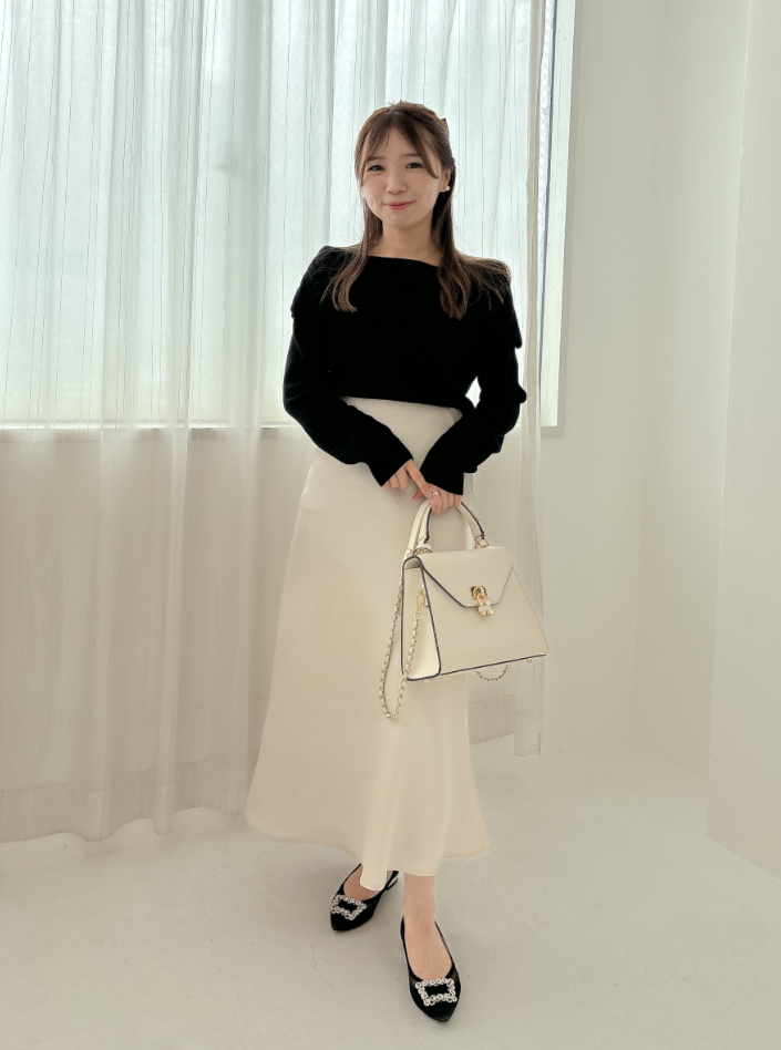 サテンは薄すぎず、通年着て頂ける厚さです。なのでインナーもひびきにくい。裏地もついているので、ホワイトも透ける心配なしです!ストレッチサテン生地を使用しているので、伸縮性がありマーメイドシルエットですが動きやすいおつくりです。