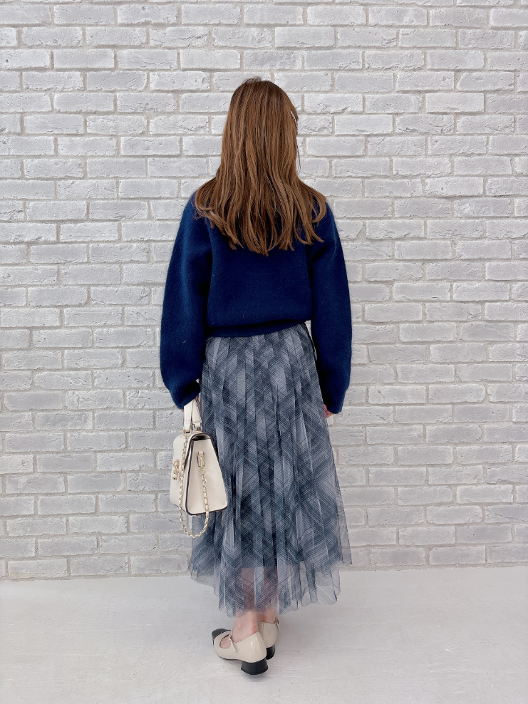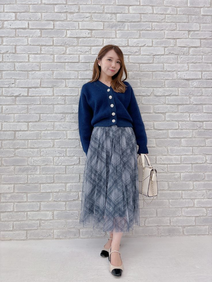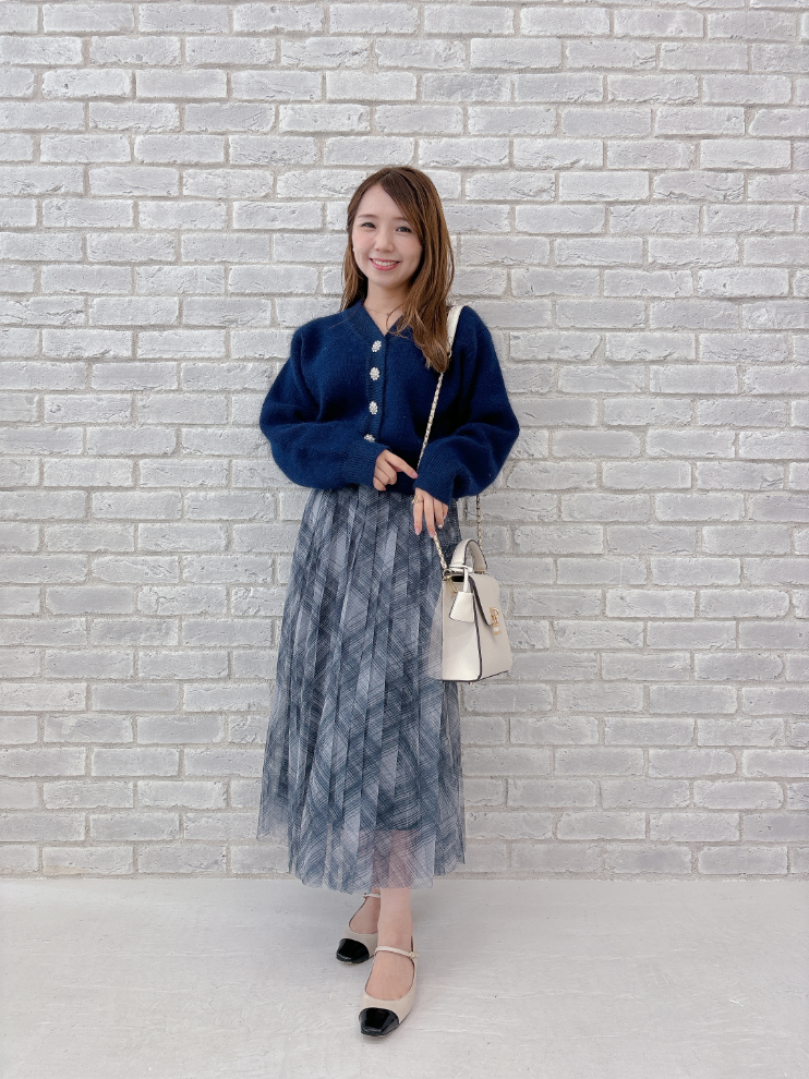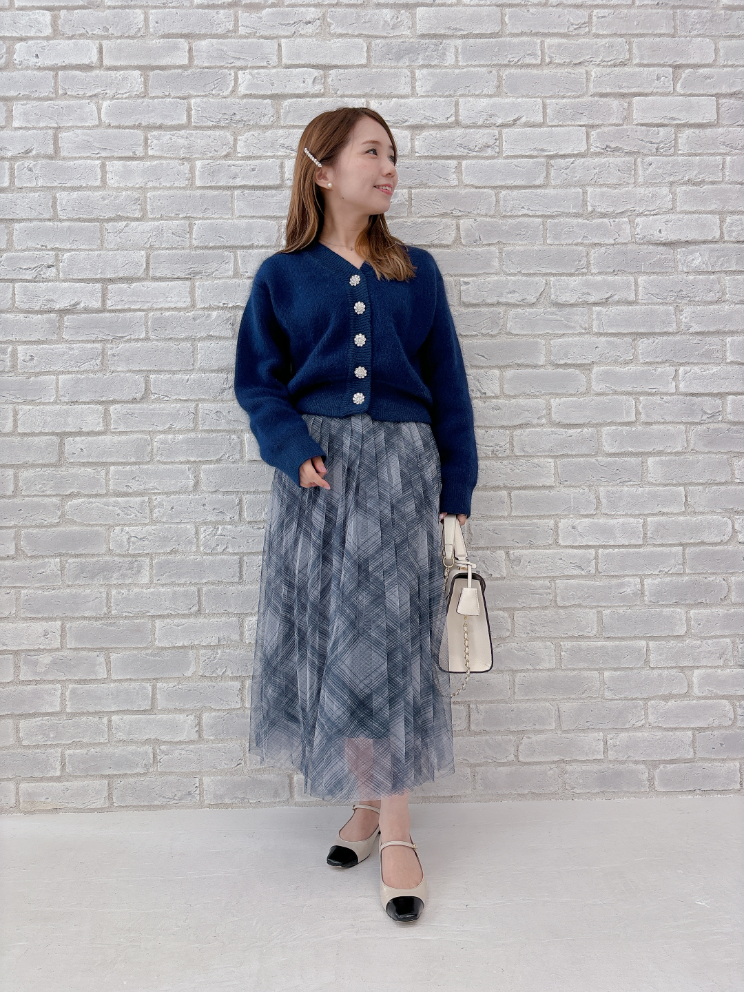 こちらは、モヘアライクビジューカーディガンとコーデ頂きたくて企画しました。ロイヤルブルーのコーデが更に一層上品エレガントに見せてくれます。