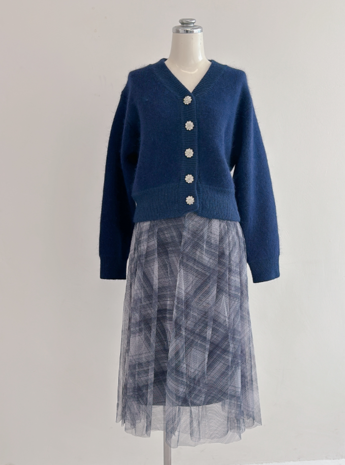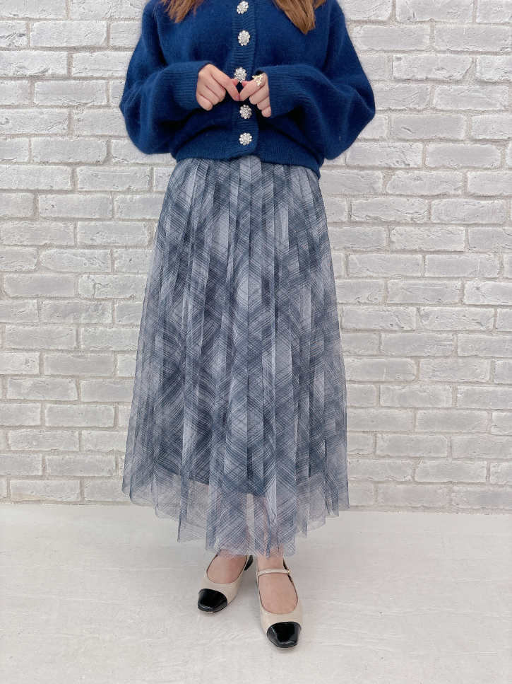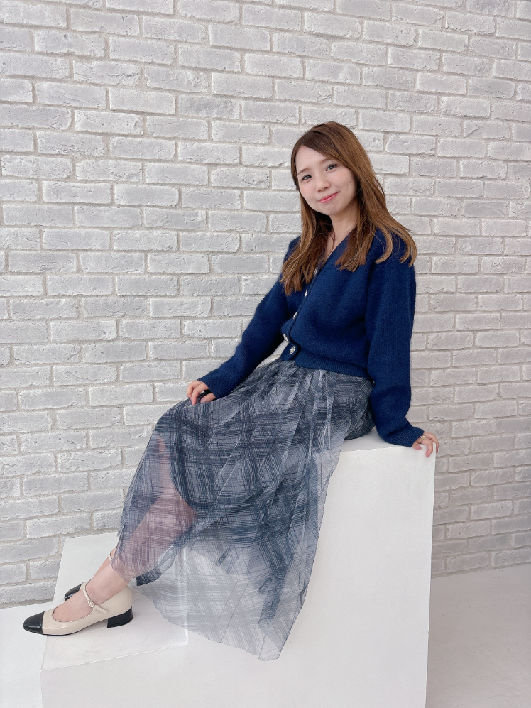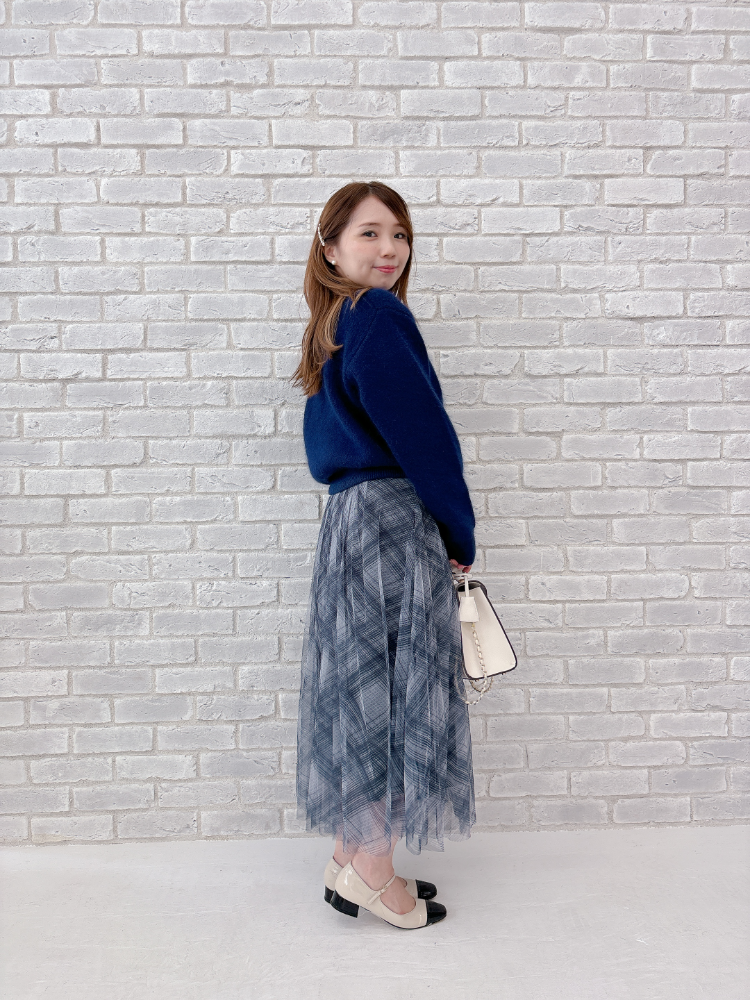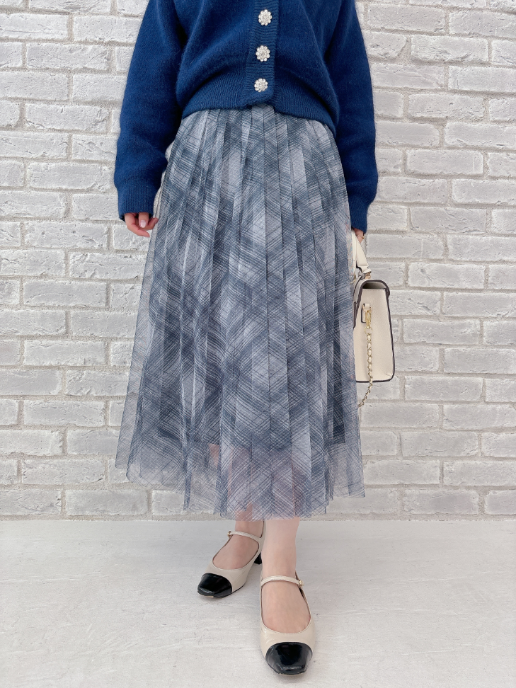 こちらは、モヘアライクビジューカーディガンとコーデ頂きたくて企画しました。ロイヤルブルーのコーデが更に一層上品エレガントに見せてくれます。