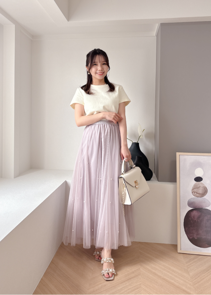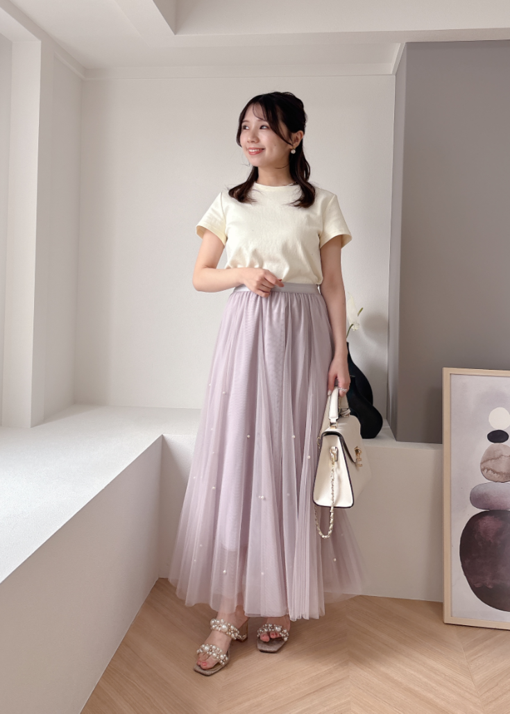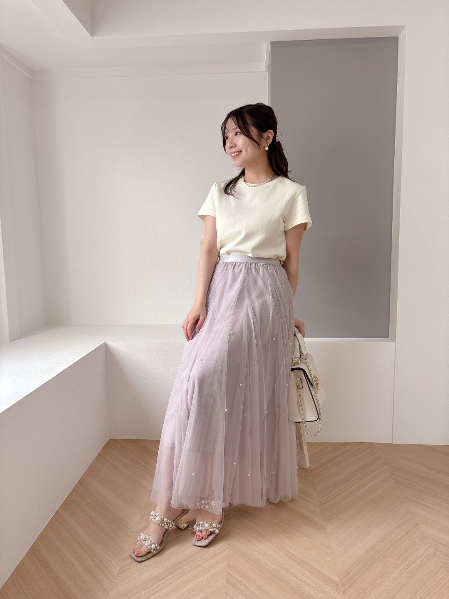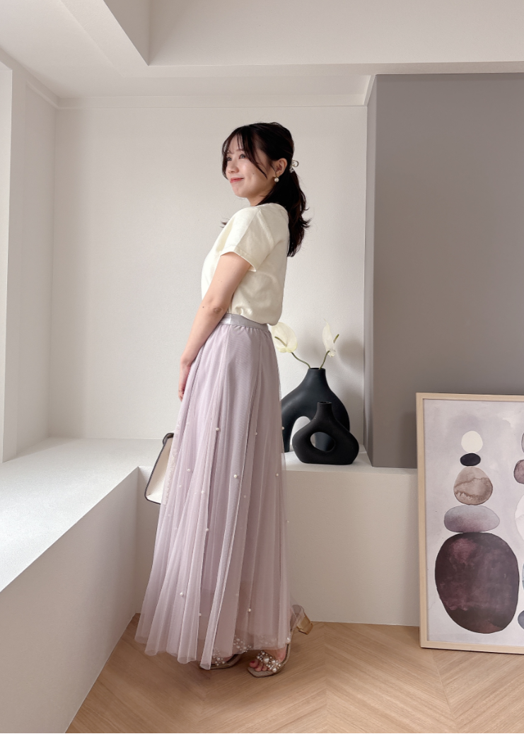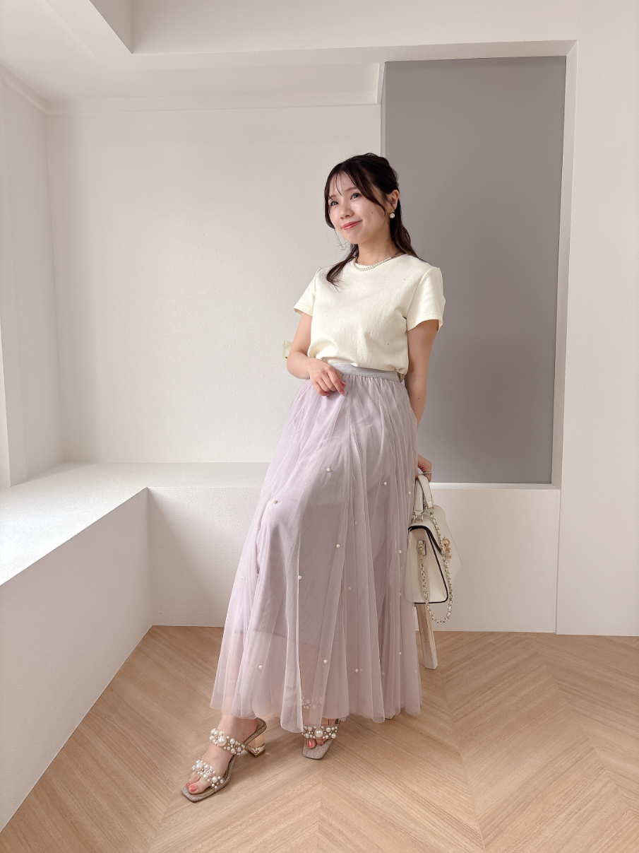ふんわりボリュームのチュールスカートと煌びやかなパールがフェミニンムードを高めてくれます。