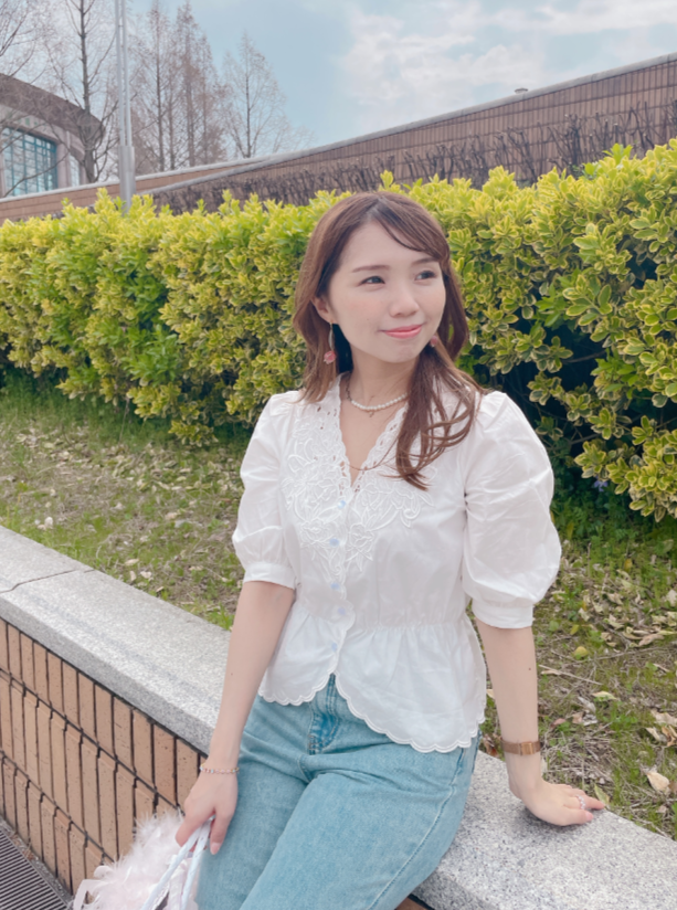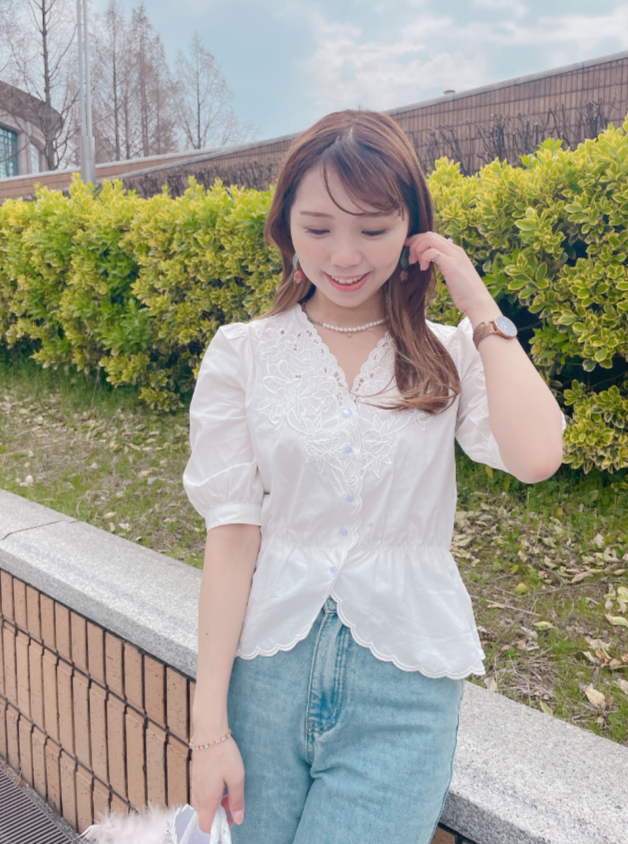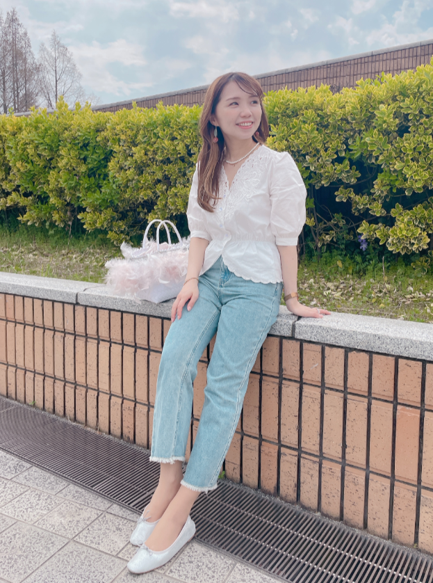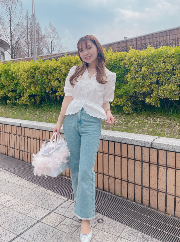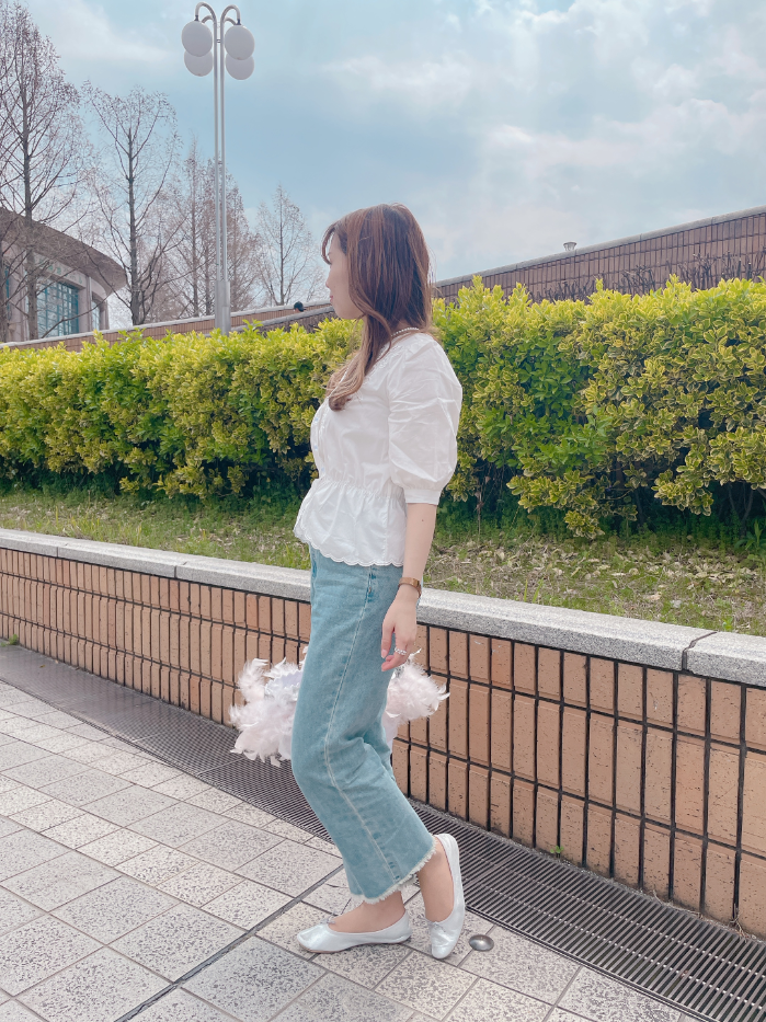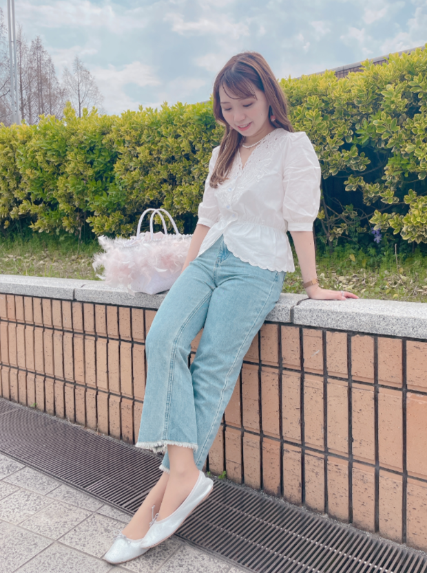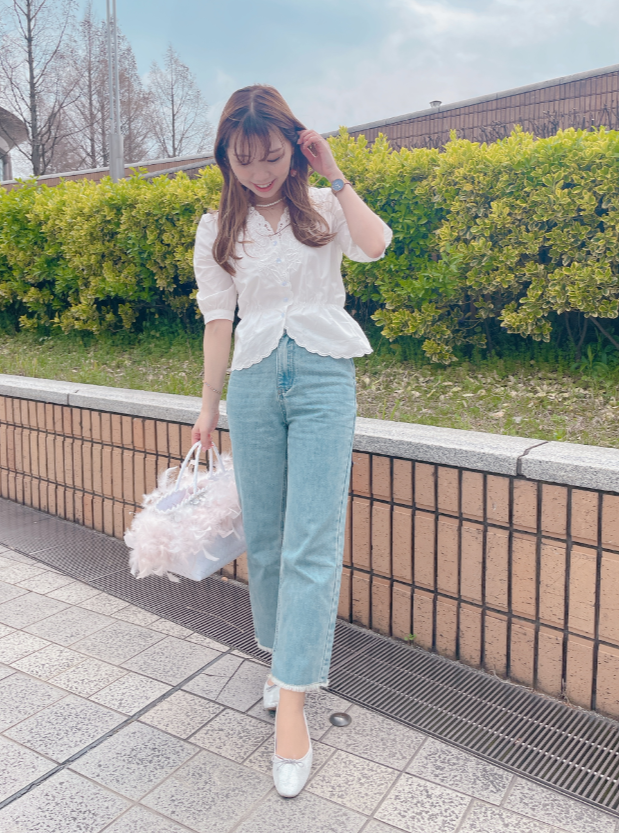 カラーパンツ・ギンガムチェックパンツ・スカートにも相性抜群ですが、ぜひとことんフレンチシックなスタイリングを楽しんで頂きたくて、「フラワー刺繍ストレートデニム」とのコーデがおすすめです♡