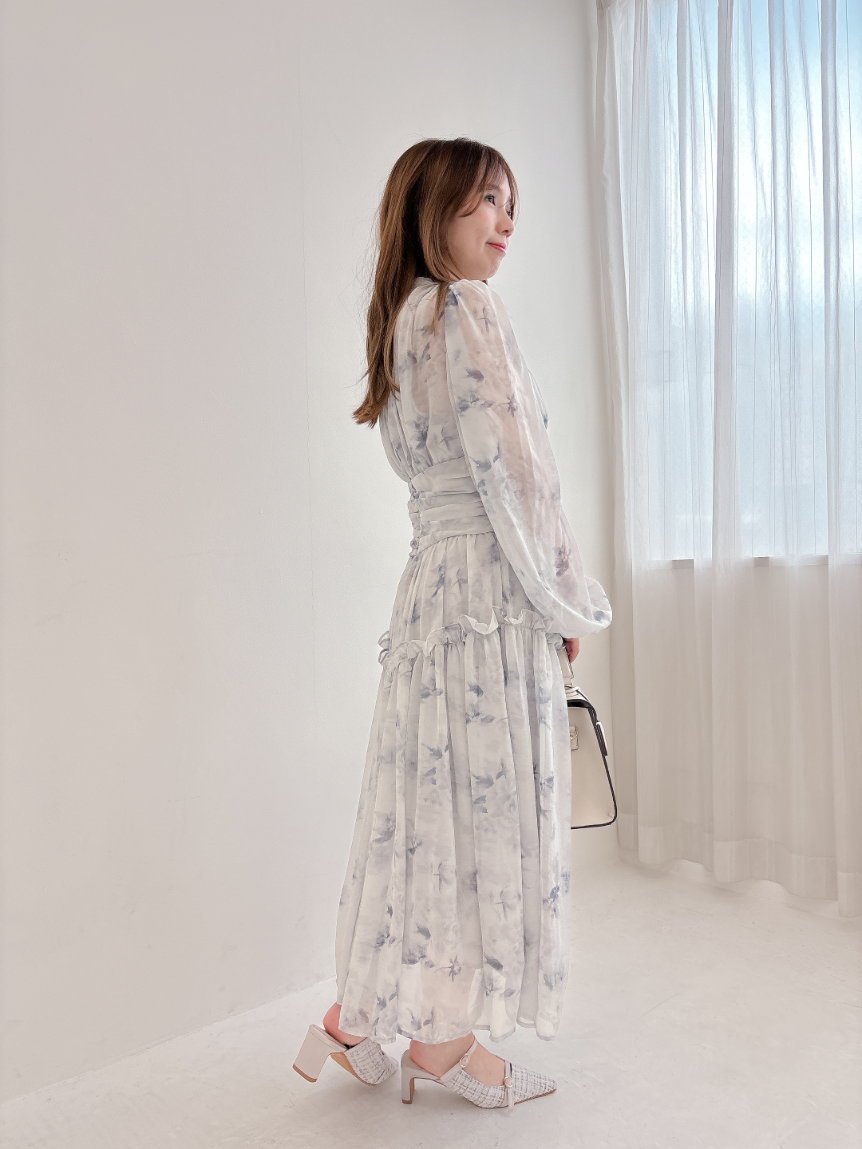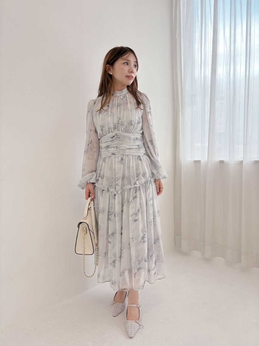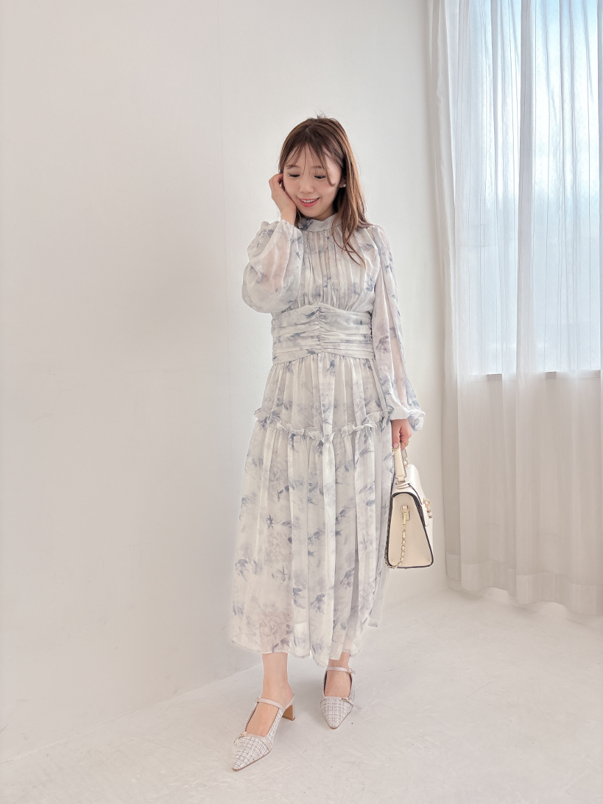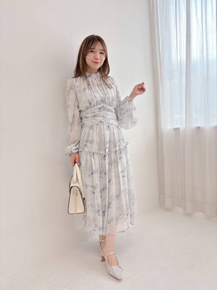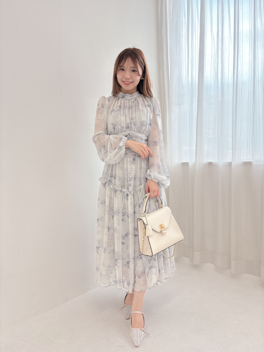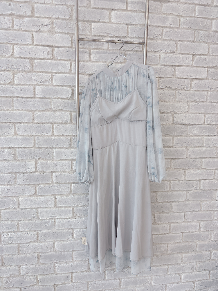 ブルーグレーのお色味なので、花柄ワンピですがかわいくなりすぎず、大人っぽく着て頂けます。
