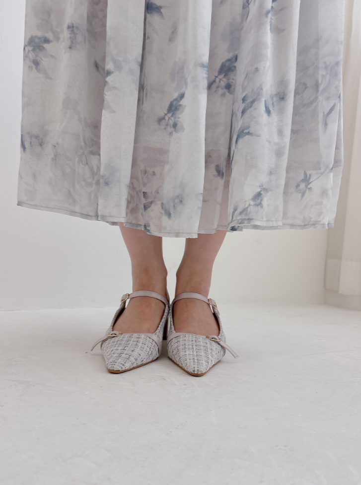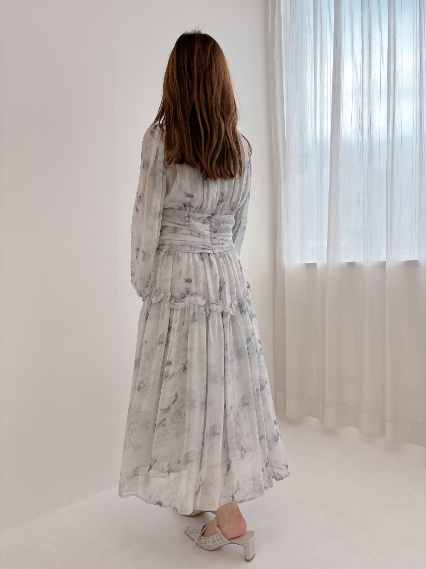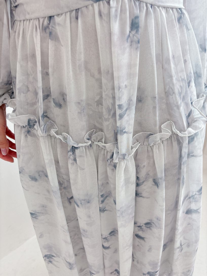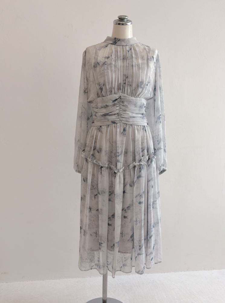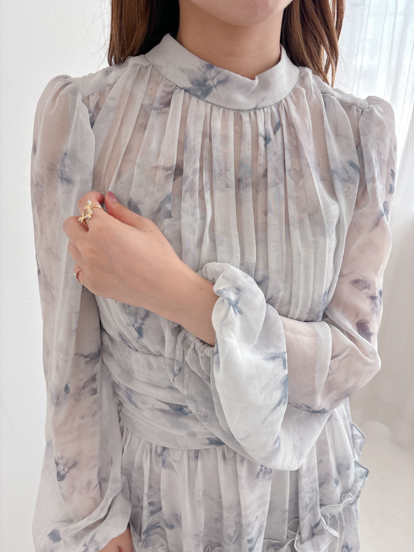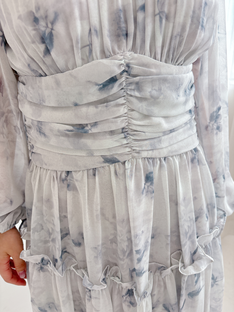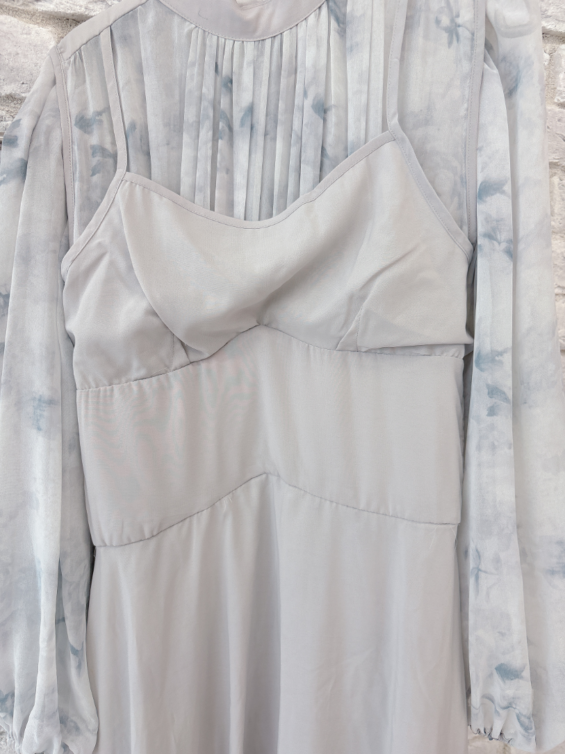 ブルーグレーのお色味なので、花柄ワンピですがかわいくなりすぎず、大人っぽく着て頂けます。