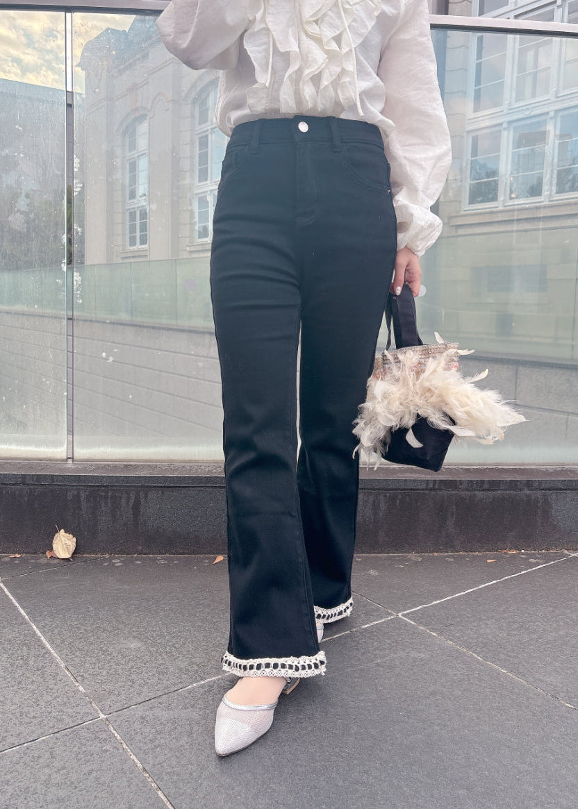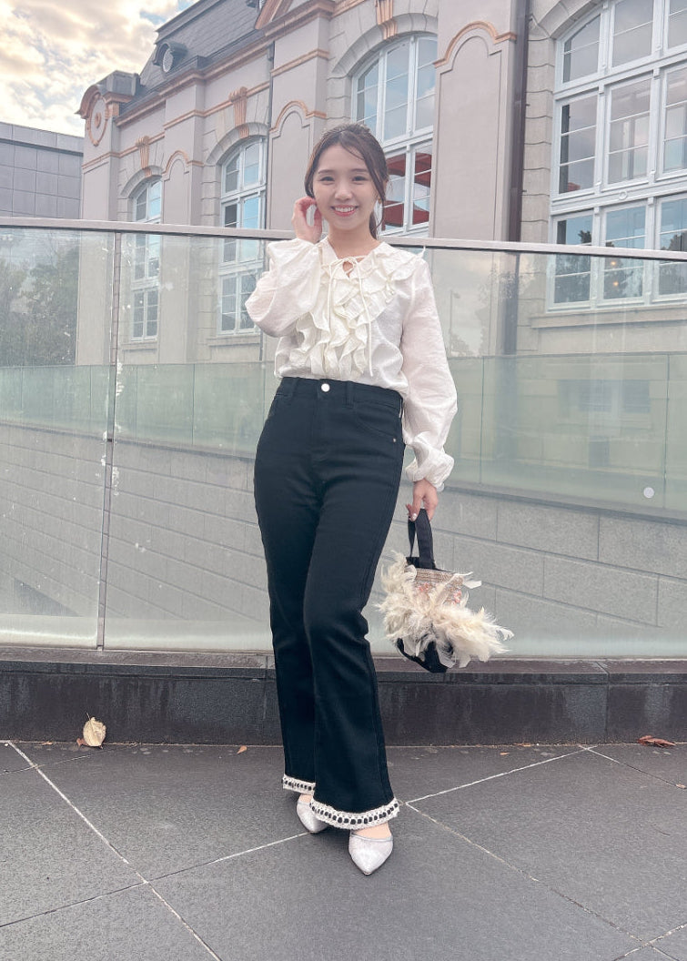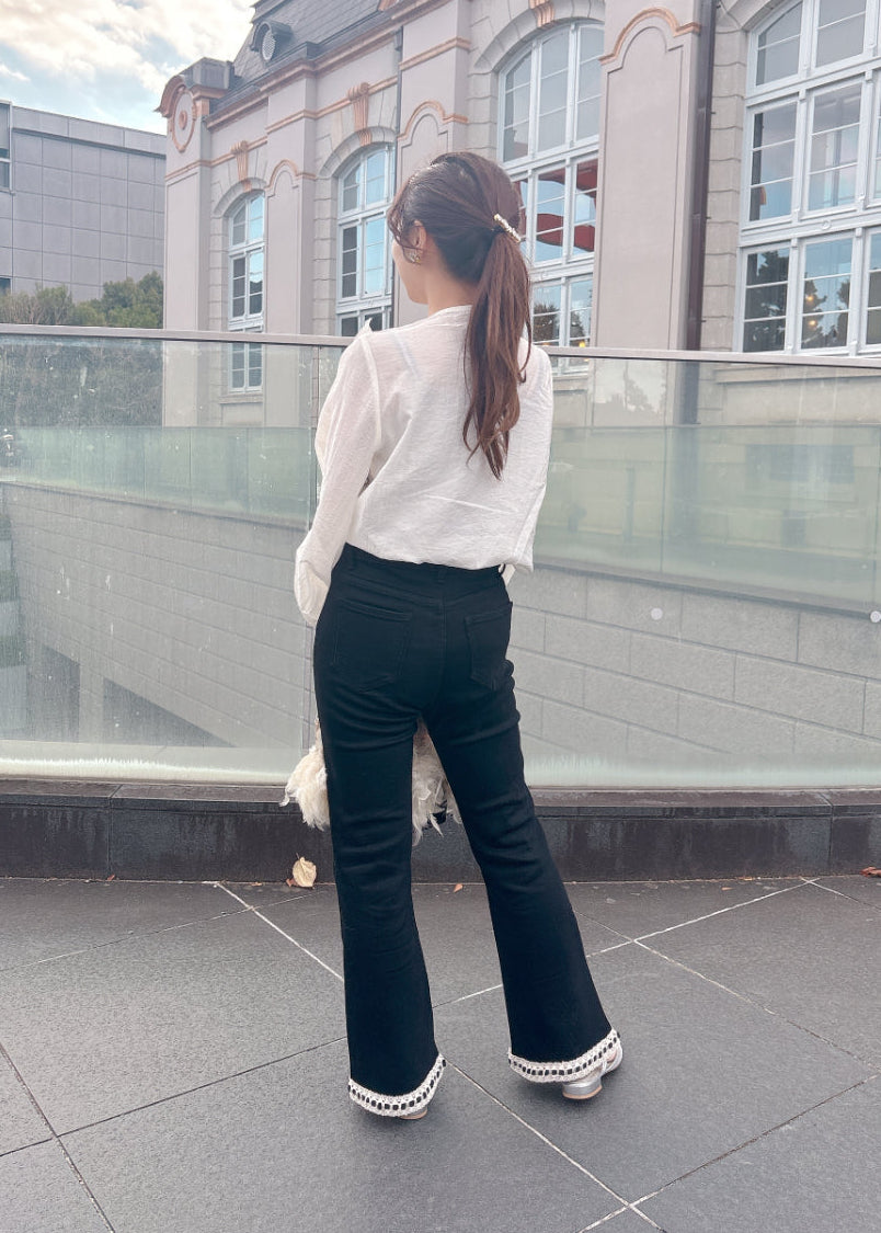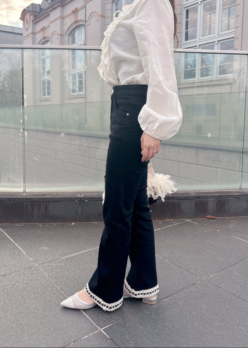 シルエットがきれいなフレアパンツ。ブラックパンツに裾のレースがアクセント♡