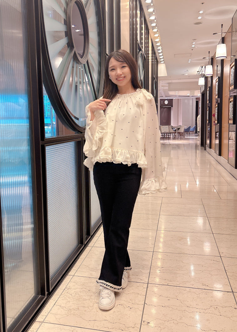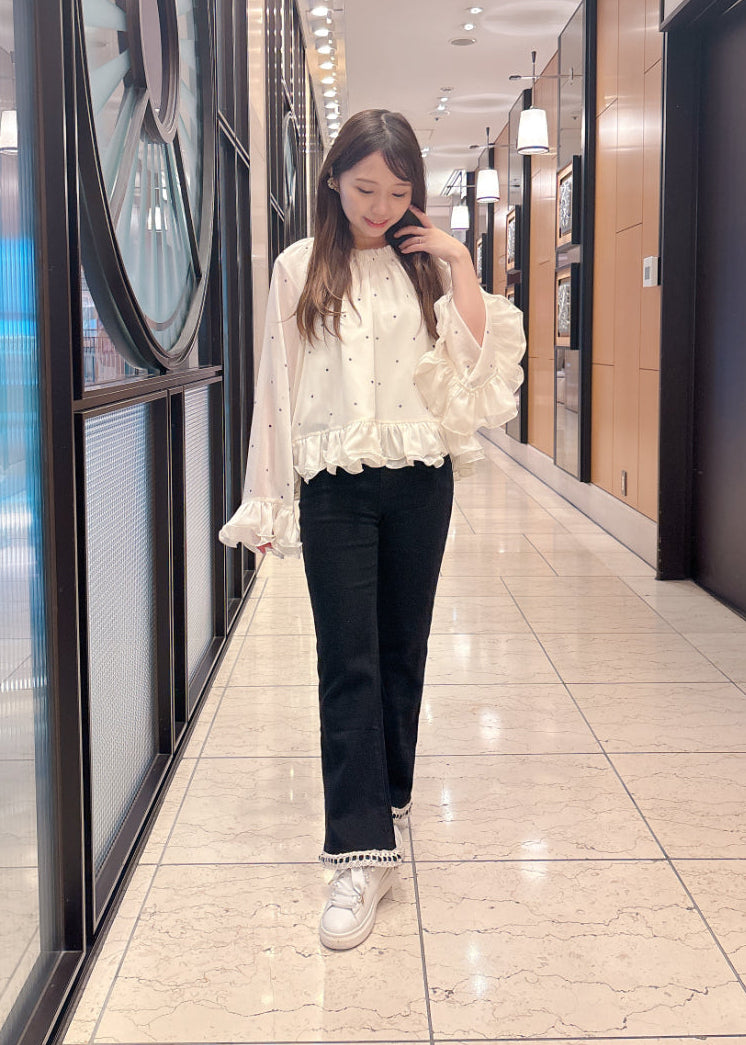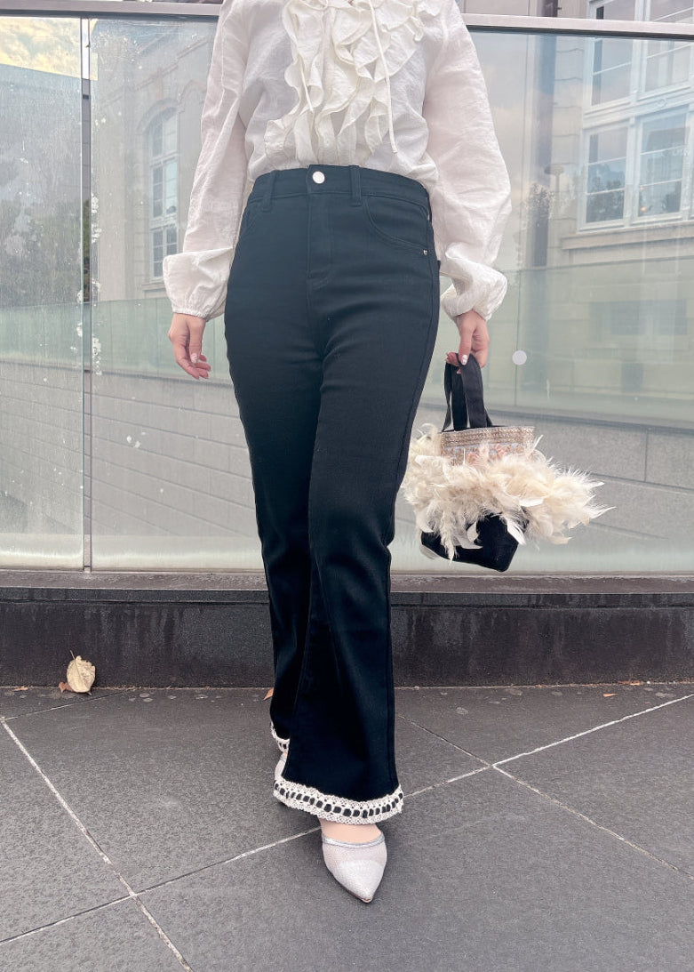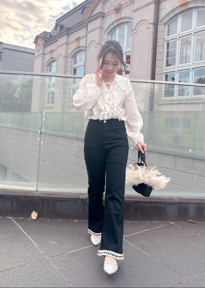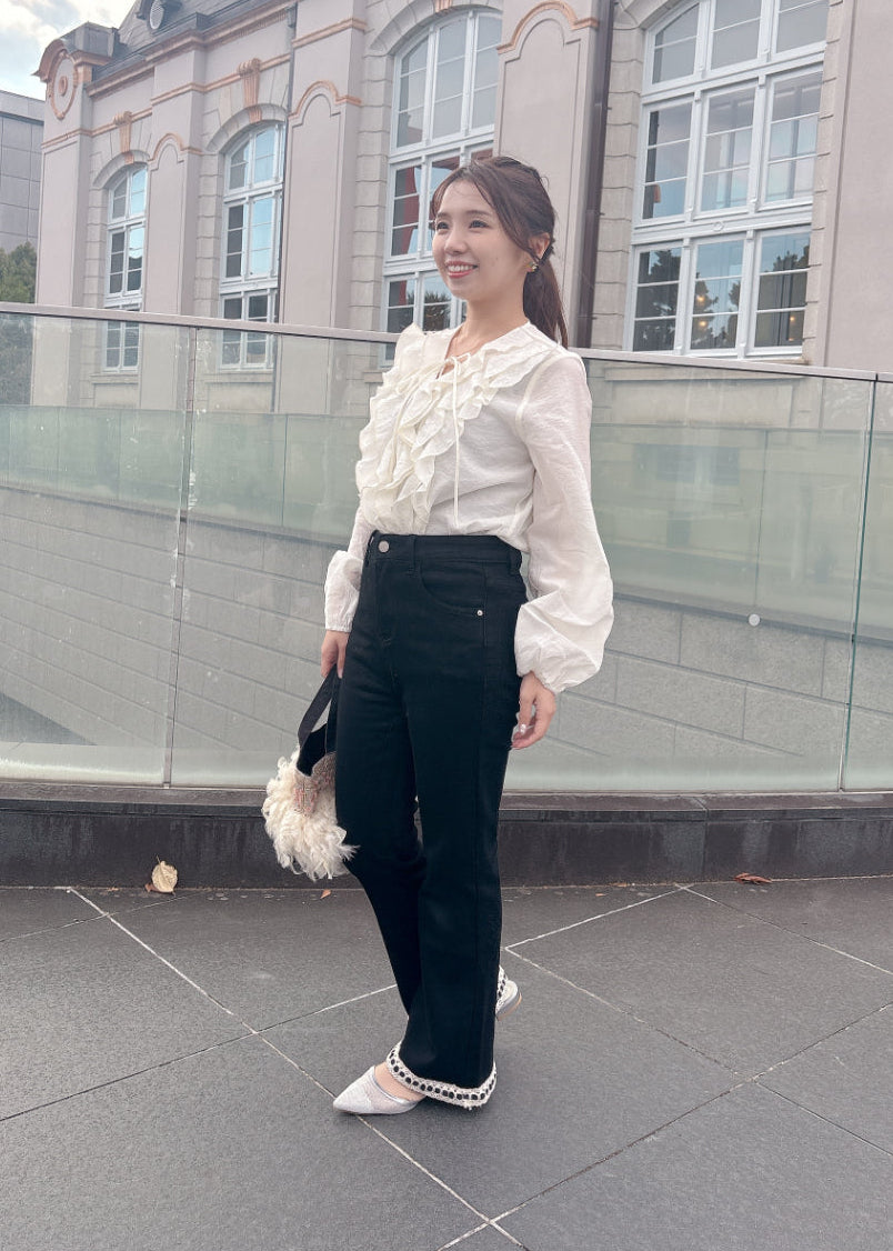 シルエットがきれいなフレアパンツ。ブラックパンツに裾のレースがアクセント♡