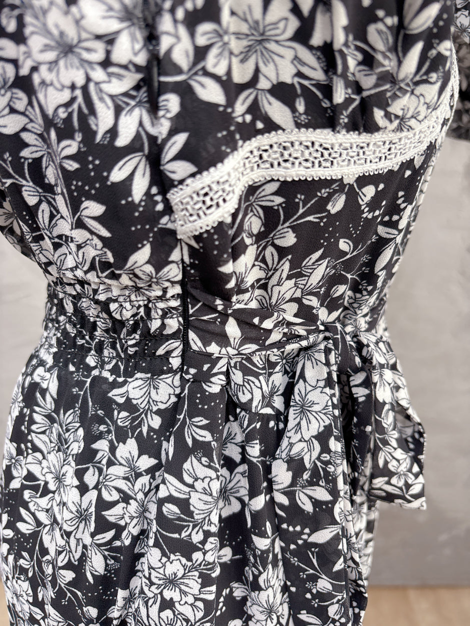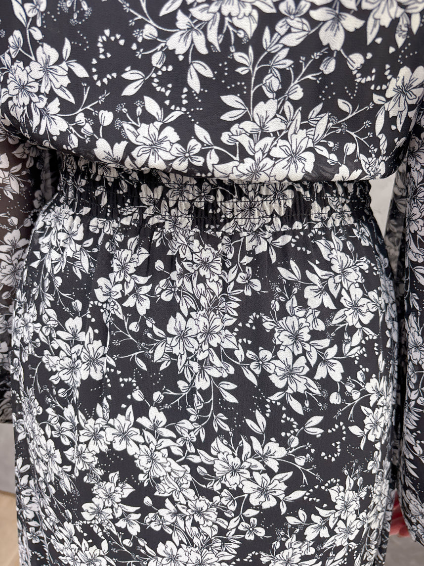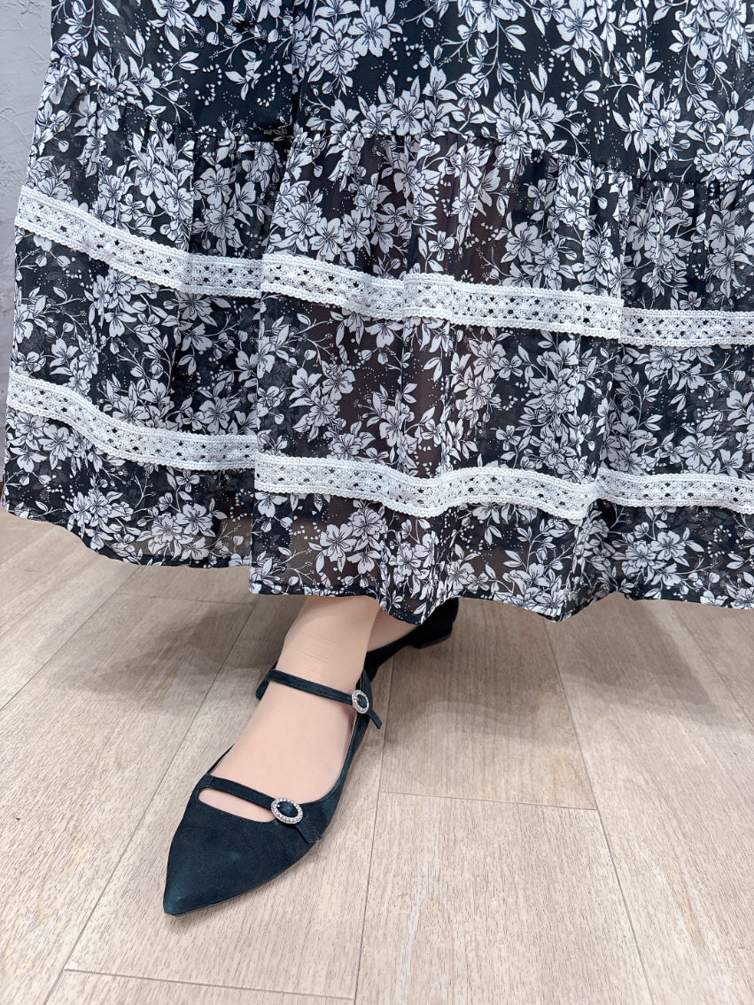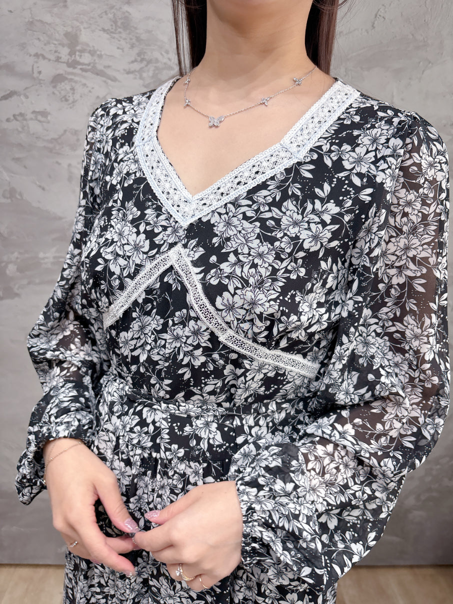 クラシックでエレガントなモノトーン花柄をプリントしたシフォン生地。