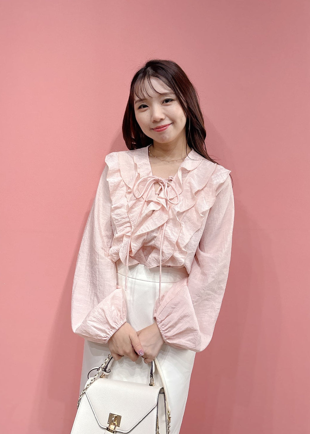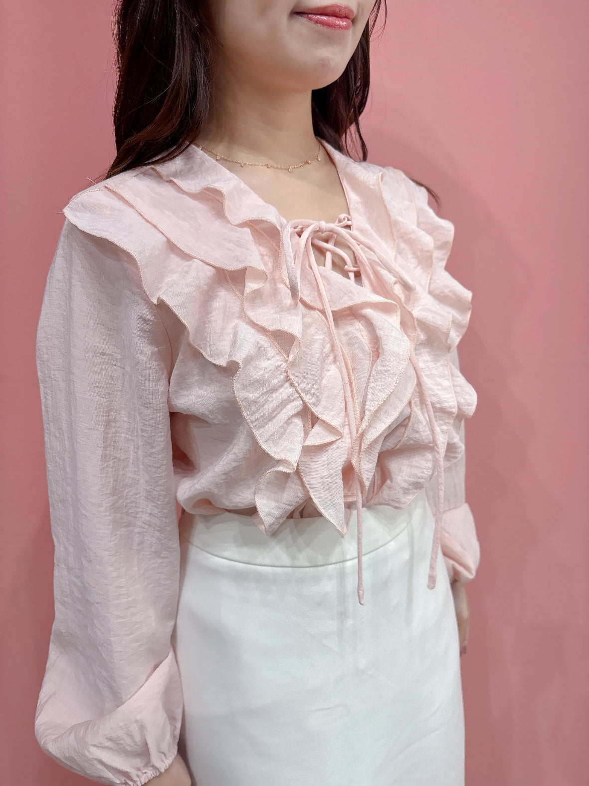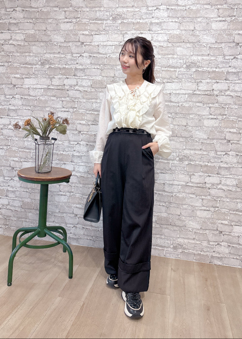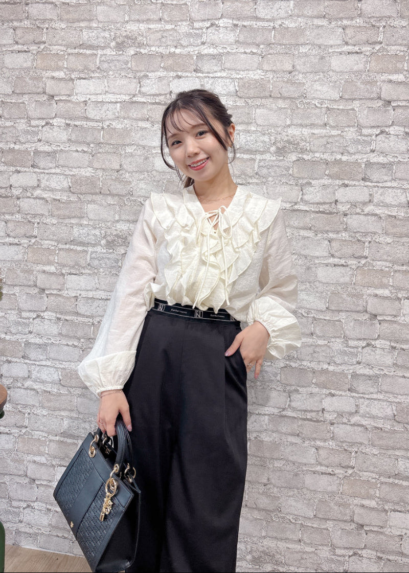 ふんわりとしたラッフルフリルが可愛らしいトレンド感のあるブラウス。気になる胸元もかわいくカバーできます。