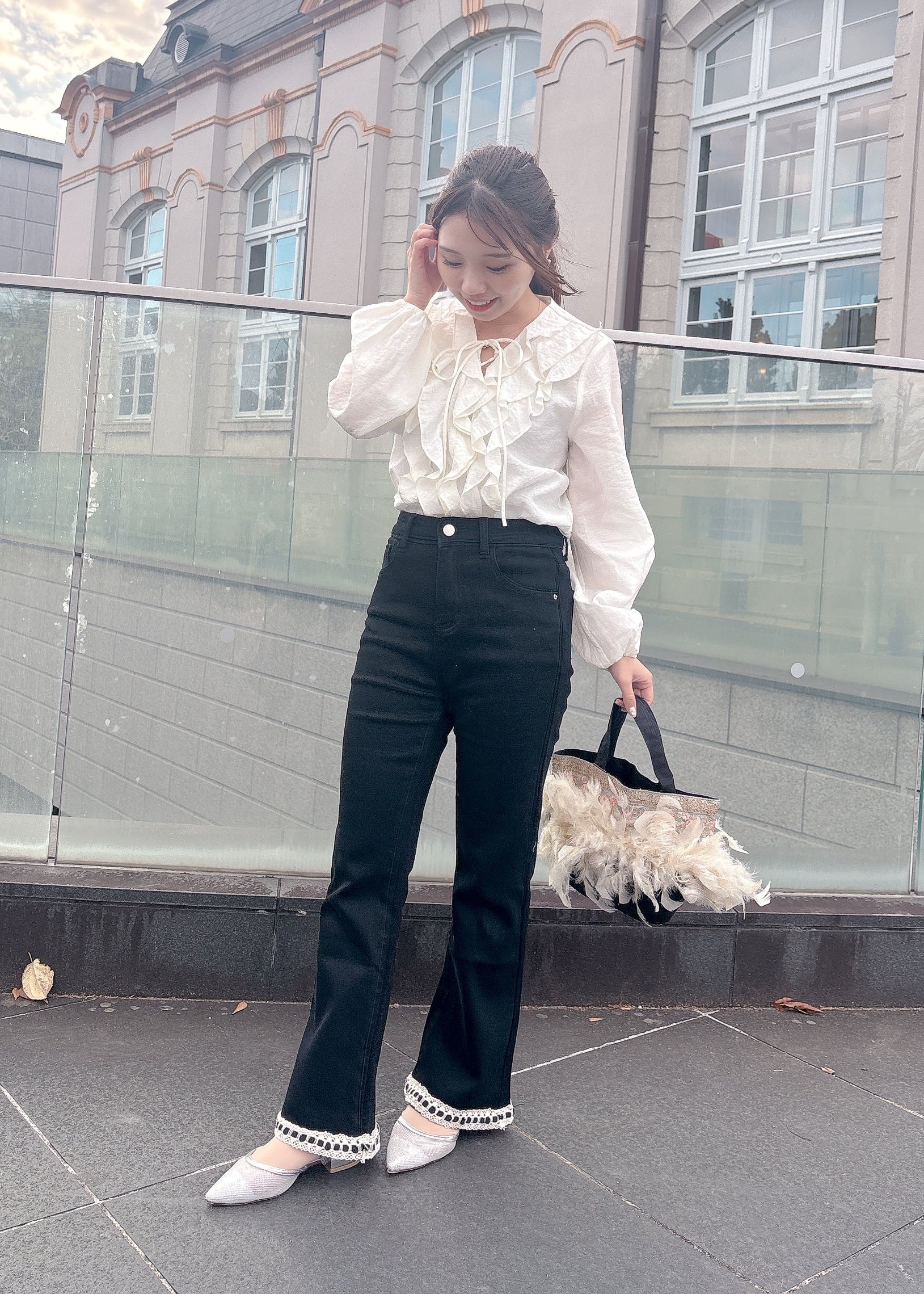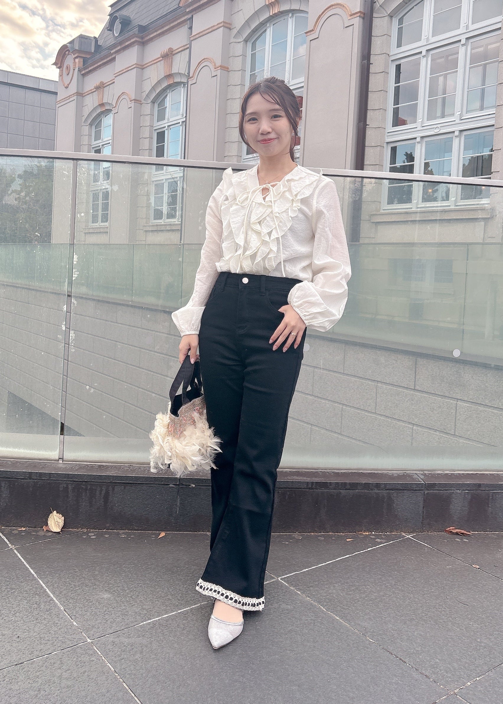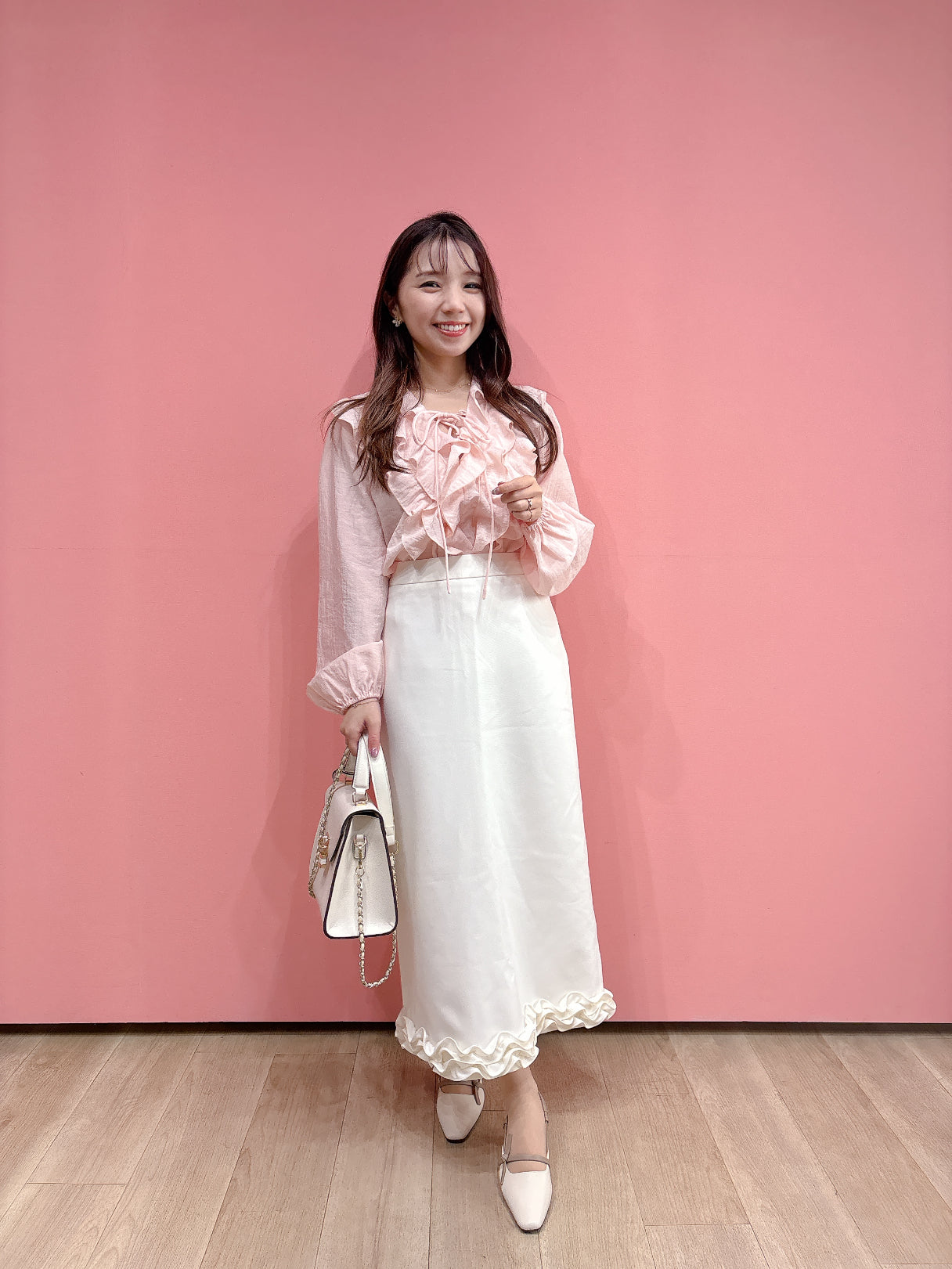 ふんわりとしたラッフルフリルが可愛らしいトレンド感のあるブラウス。気になる胸元もかわいくカバーできます。