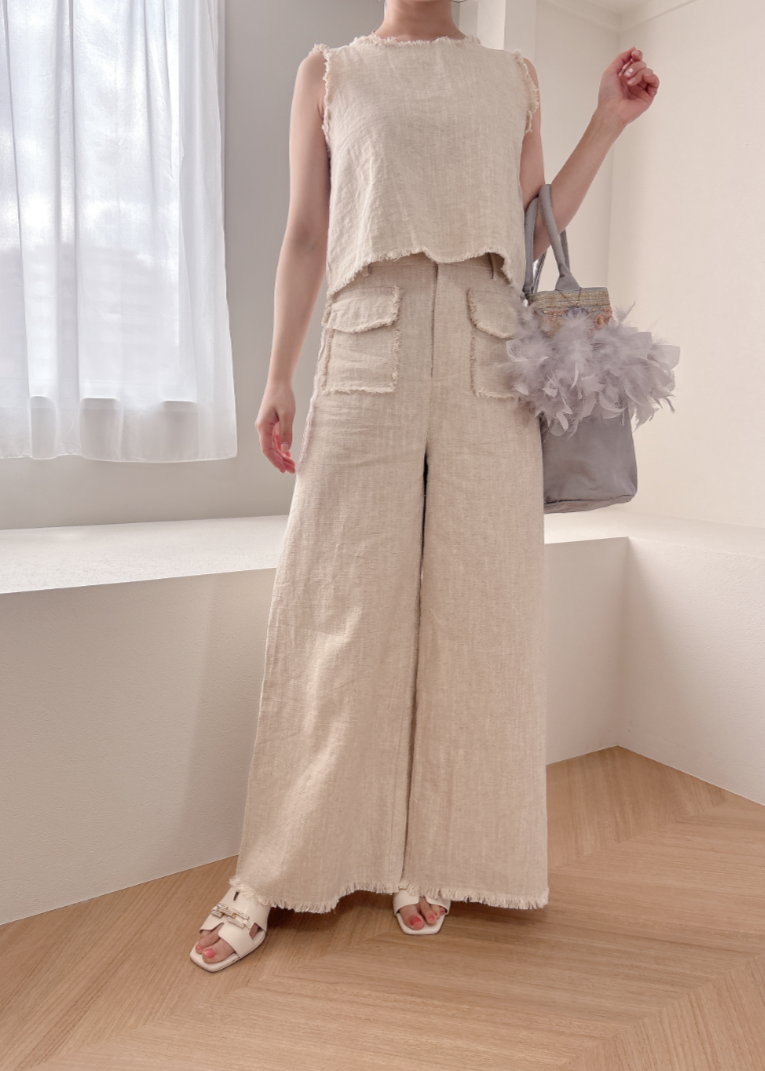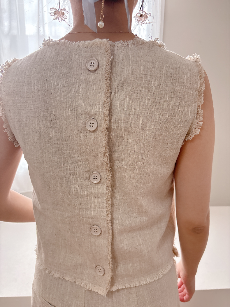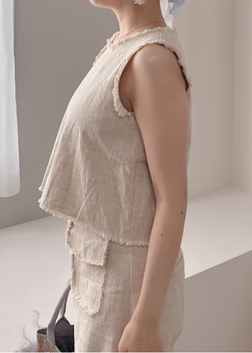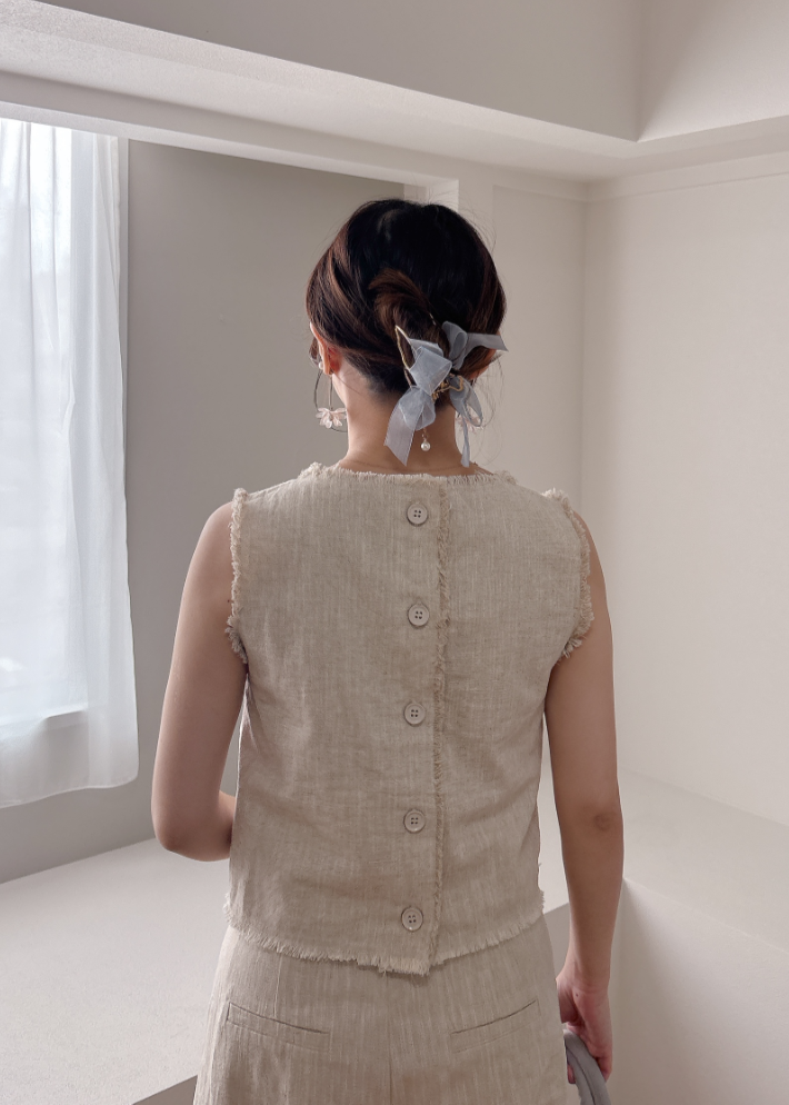 一見シンプルに見えますが、後ろのボタンデザインや裾のフリンジ、フロントポケットなどさりげないデザインが差をつけてくれます。