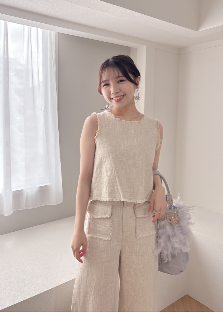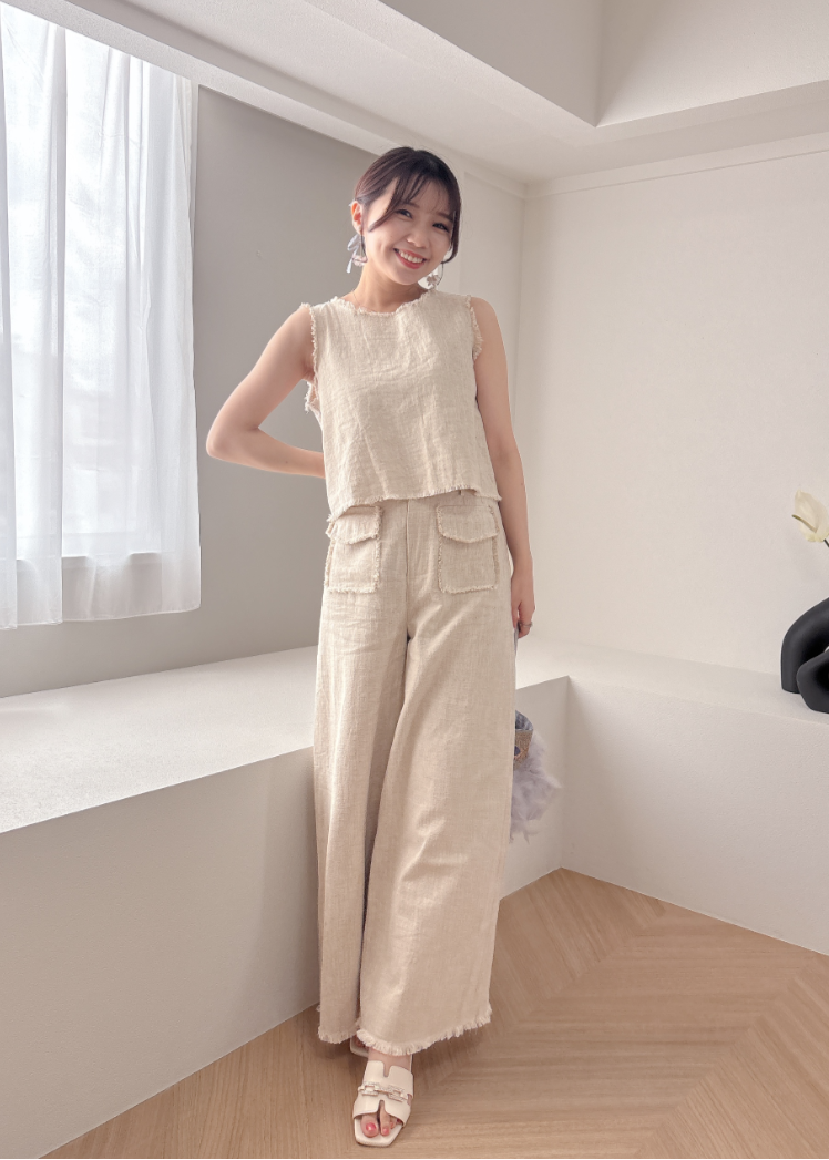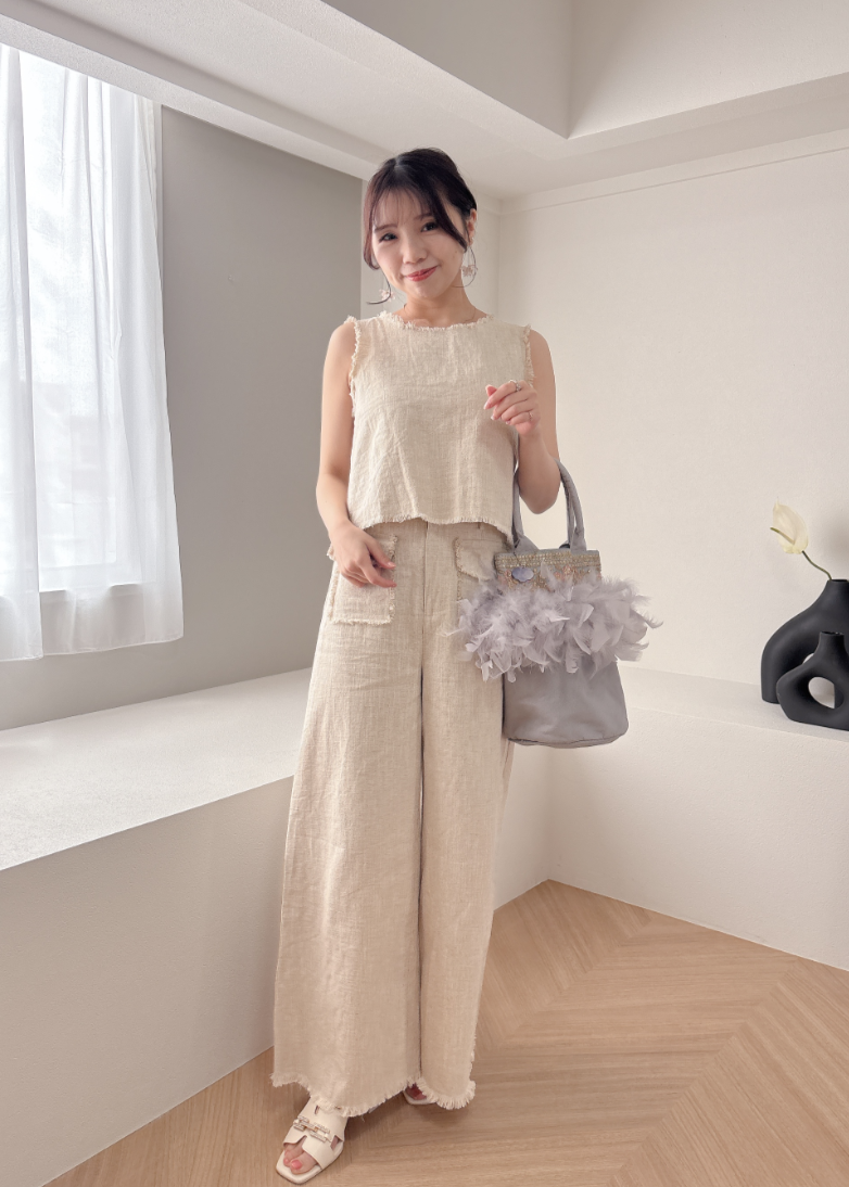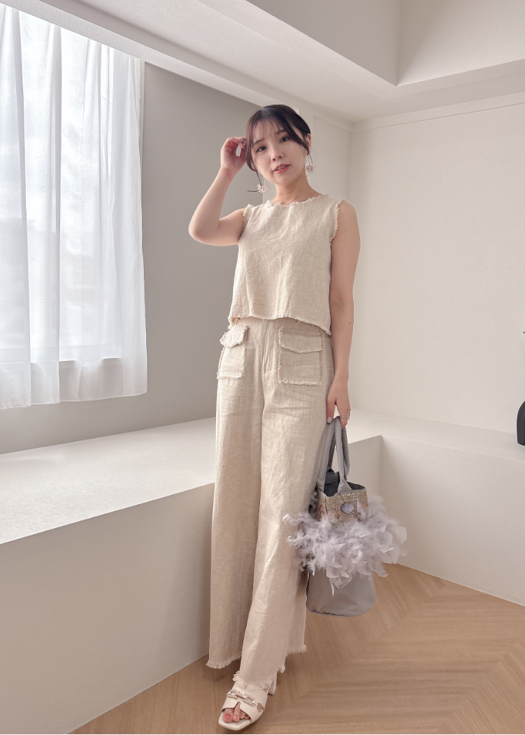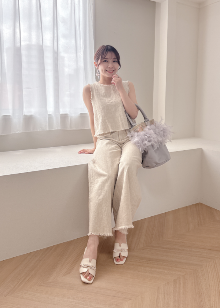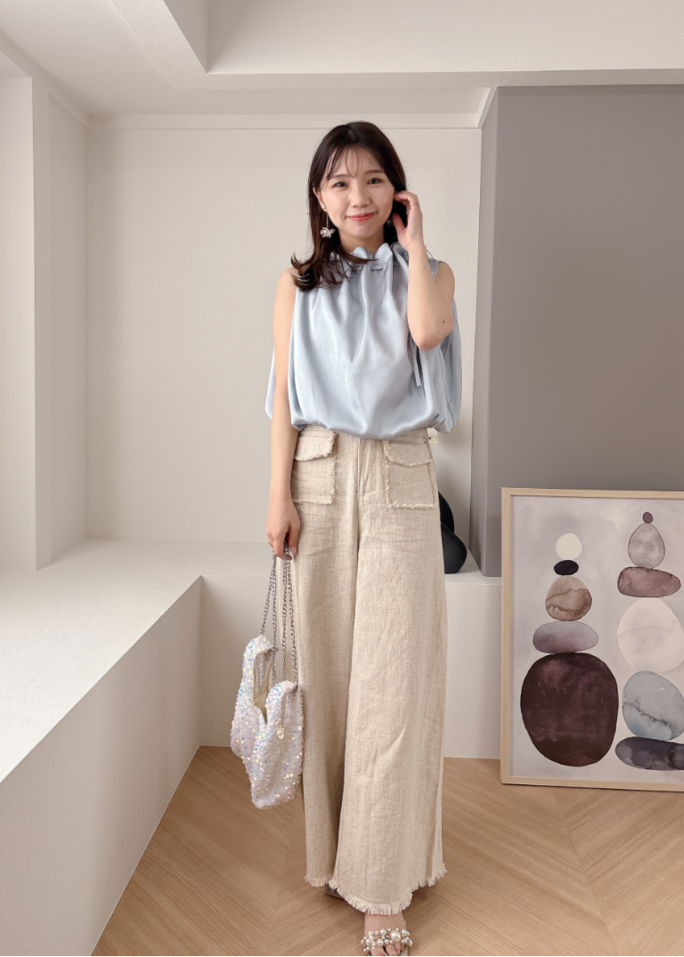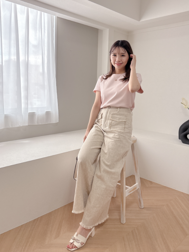パンツはハイウエスト&ほどよいワイドシルエットなので、スタイルがぐんとアップします。