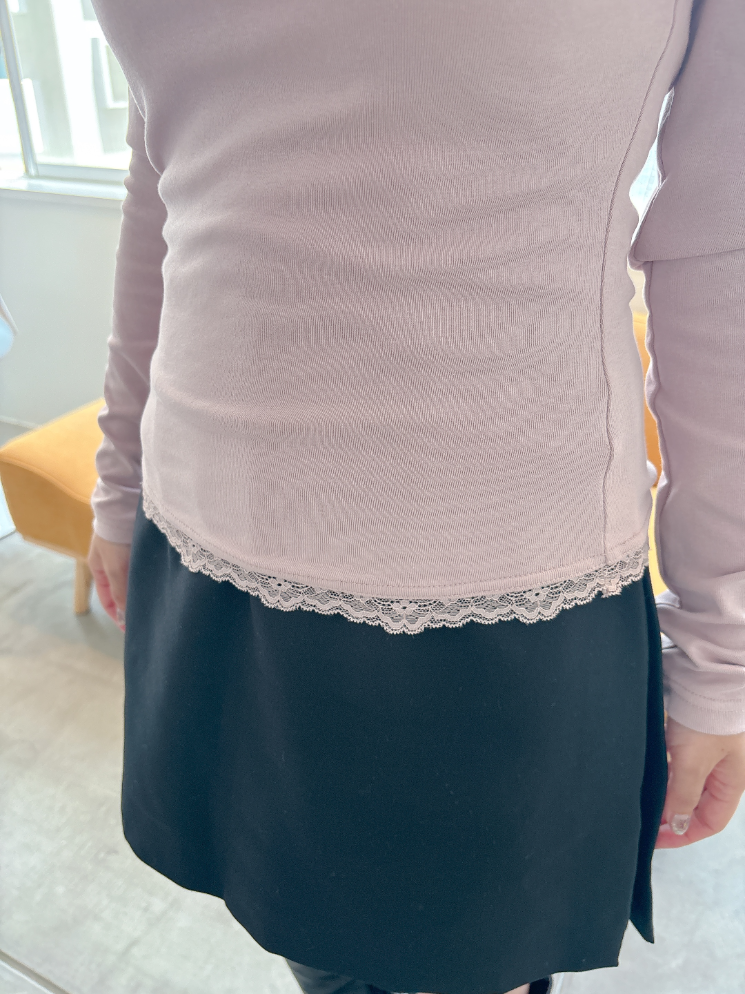 肩回り・袖丈・身幅全て小柄設計なので、ぴったり上品に着用頂けます。肩からインナーが見えることもありません。気になる胸元はかわいくレースでカバー♡斜めになったレースがレイヤードデザインでこなれみえです。裾にもレースつき。