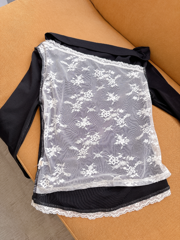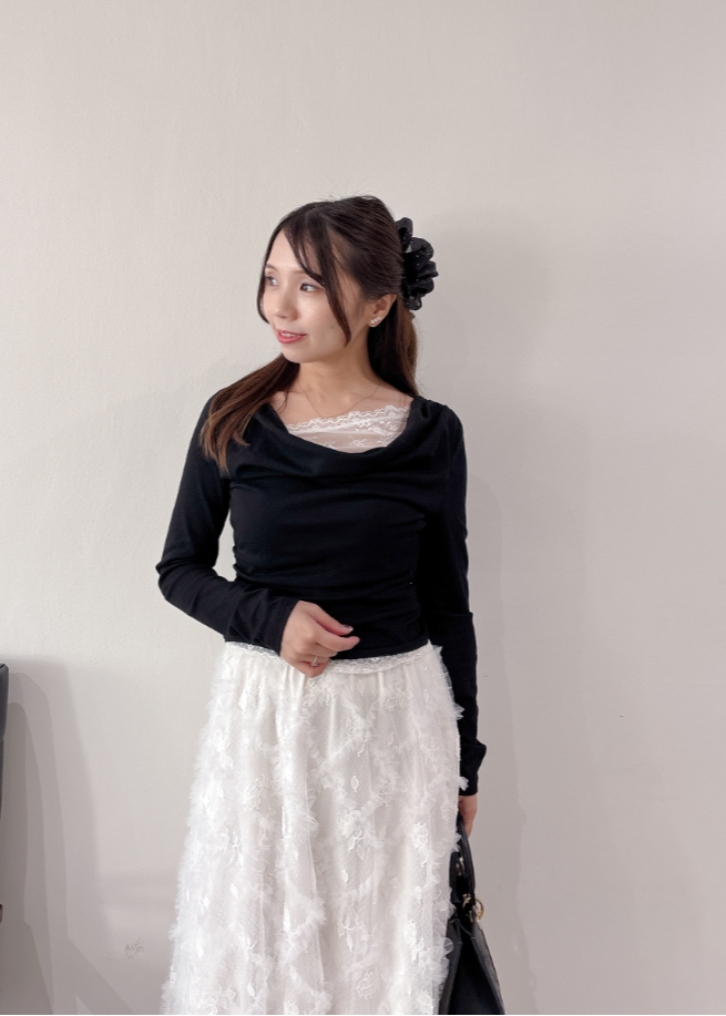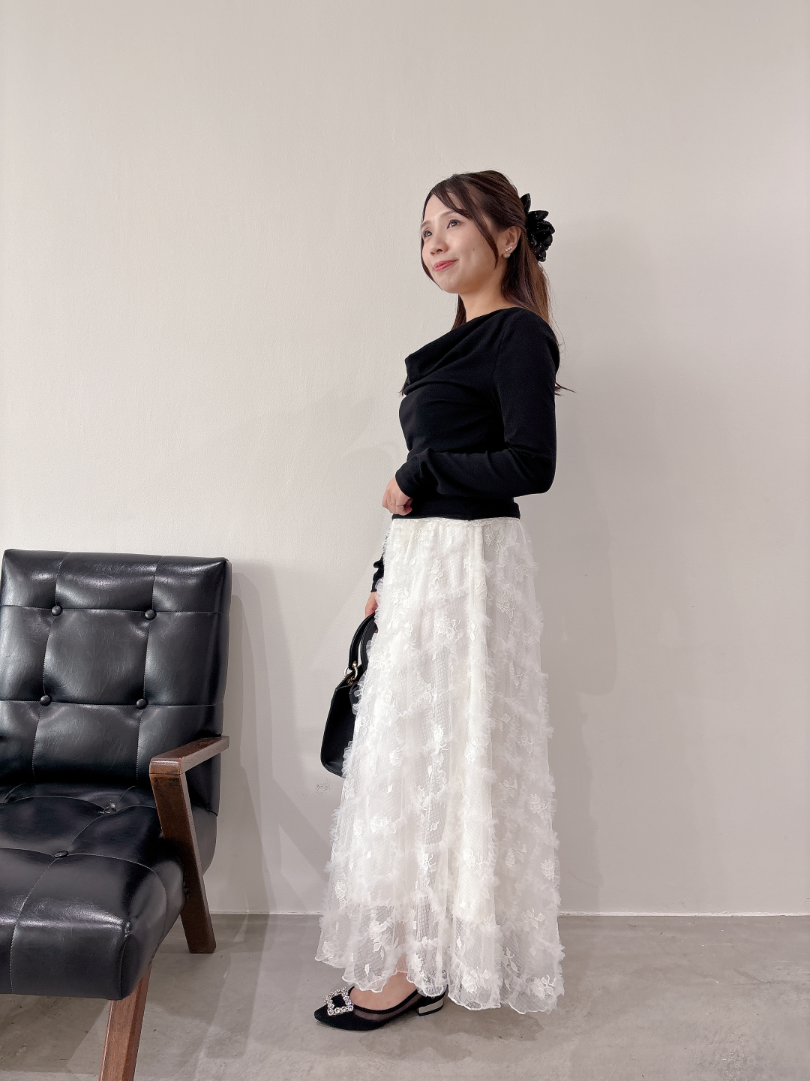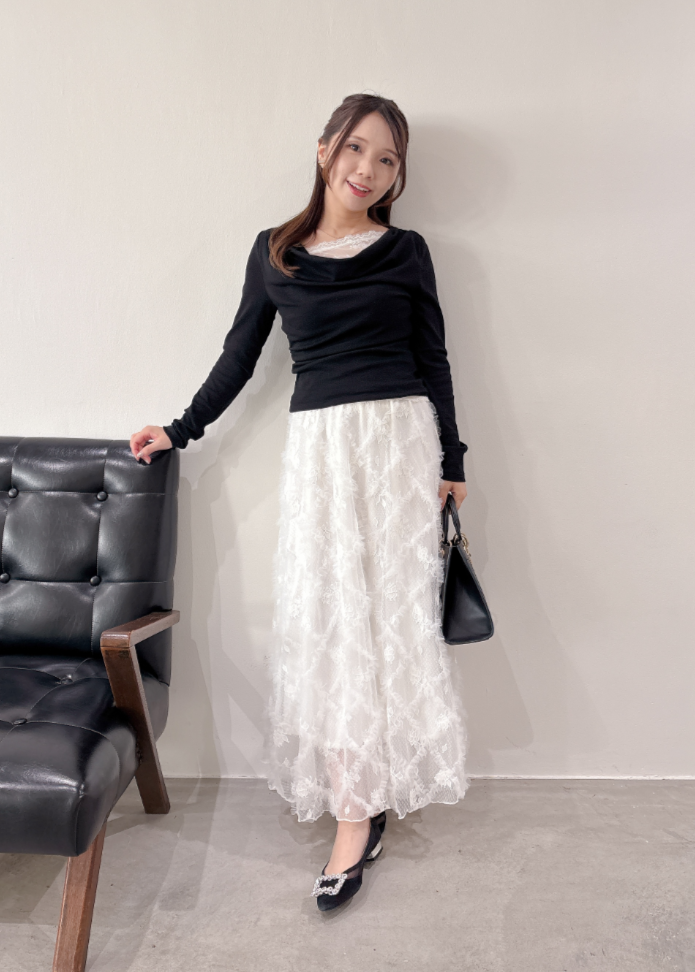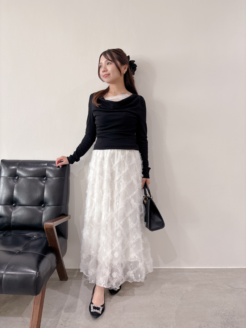 ホワイト・ピンクは同色系のレースですが、ブラックはホワイトレースなので、コントラストを楽しめます。ブラックは3Dフラワースカートを合わせて着用すると、ドッキングワンピを着ているかのように相性抜群です。