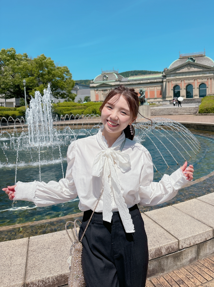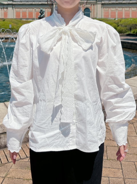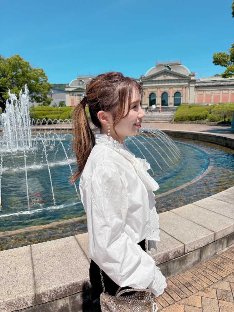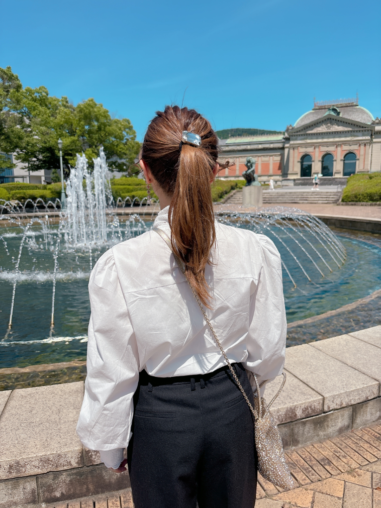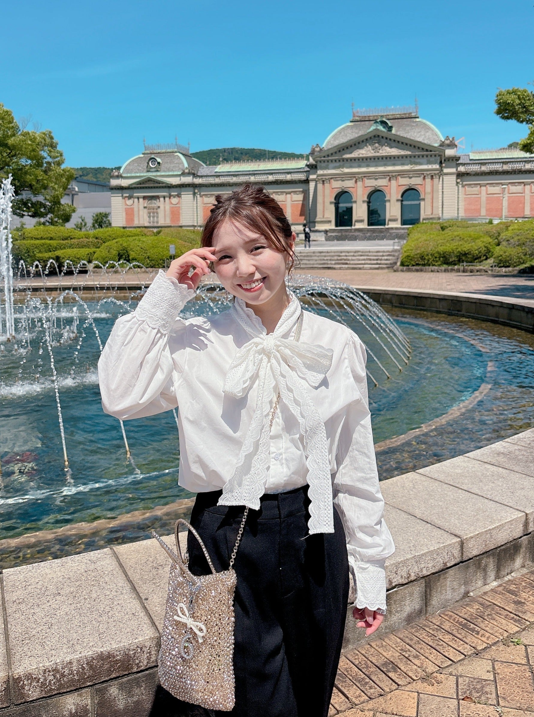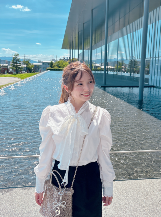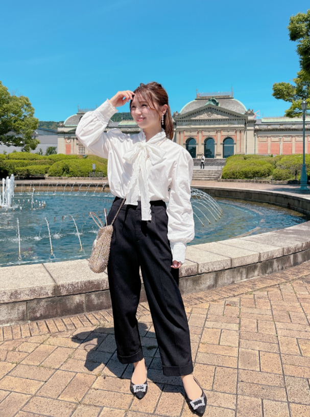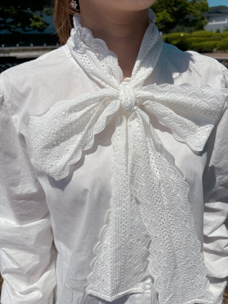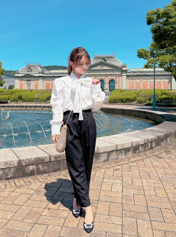 リボンは大き目なので、しっかり存在感があります。1枚で着て小顔効果をもたらすことはもちろん、カーディガンやジャケットと合わせてリボンを出して着るコーデもおすすめです!
