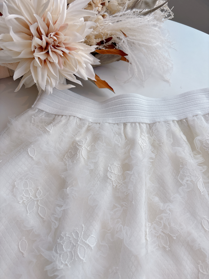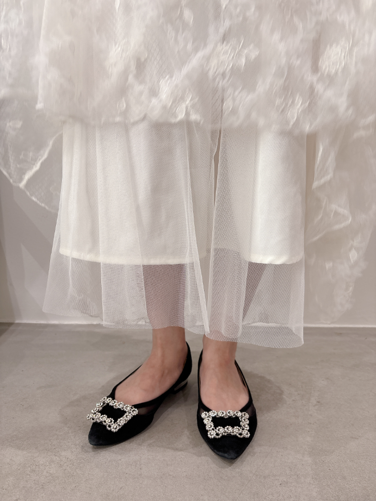 チュールは2層になっており、一番上の生地にはシアー感がある3Dフラワーと、更にチュールが格子状に施されています。