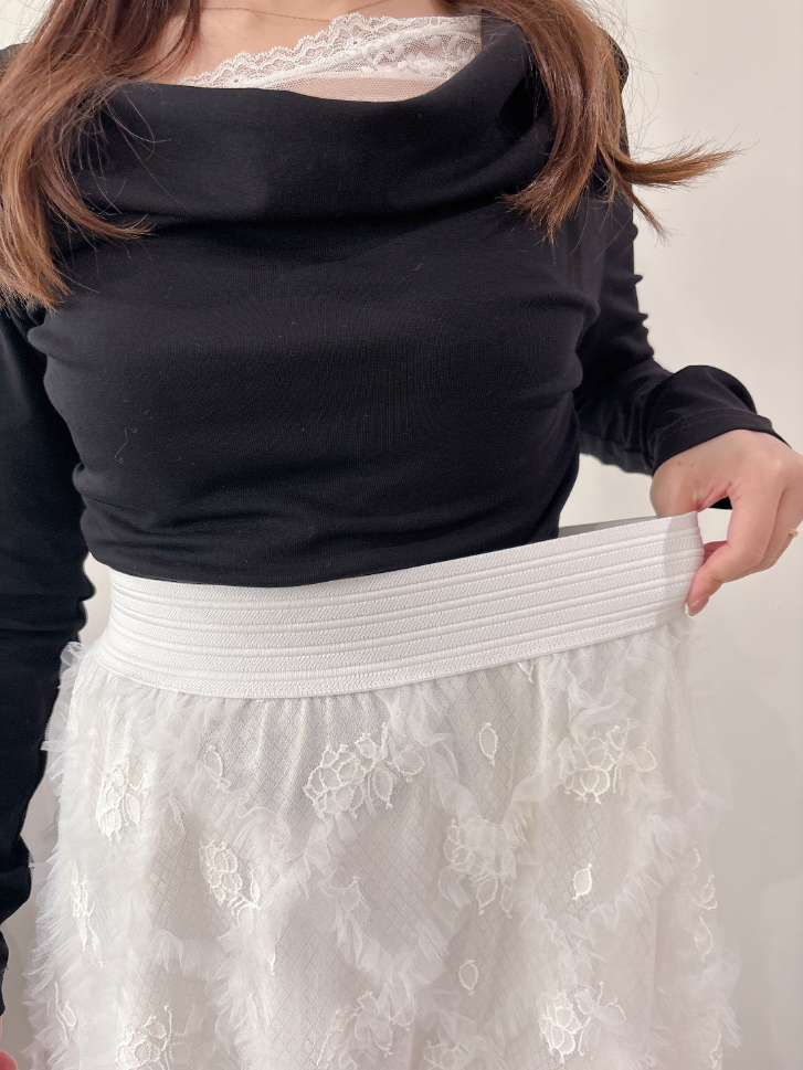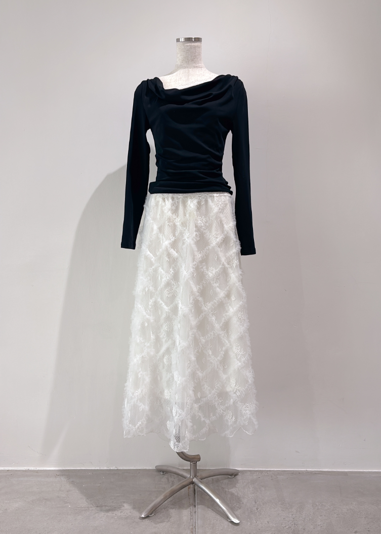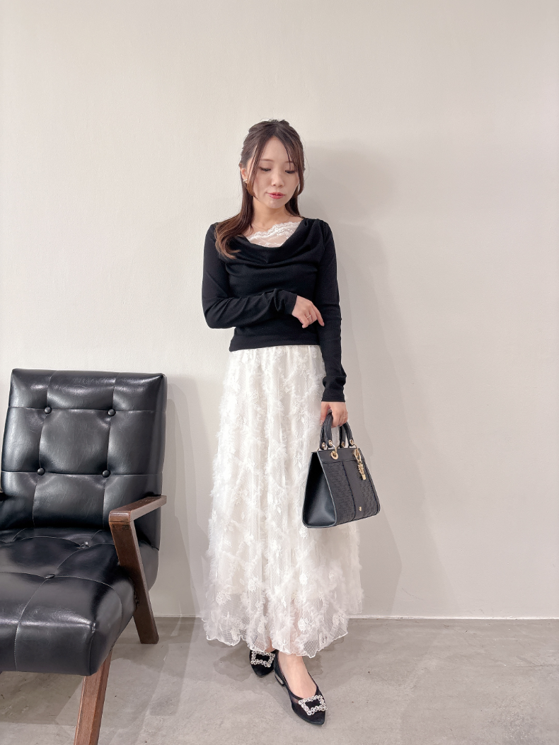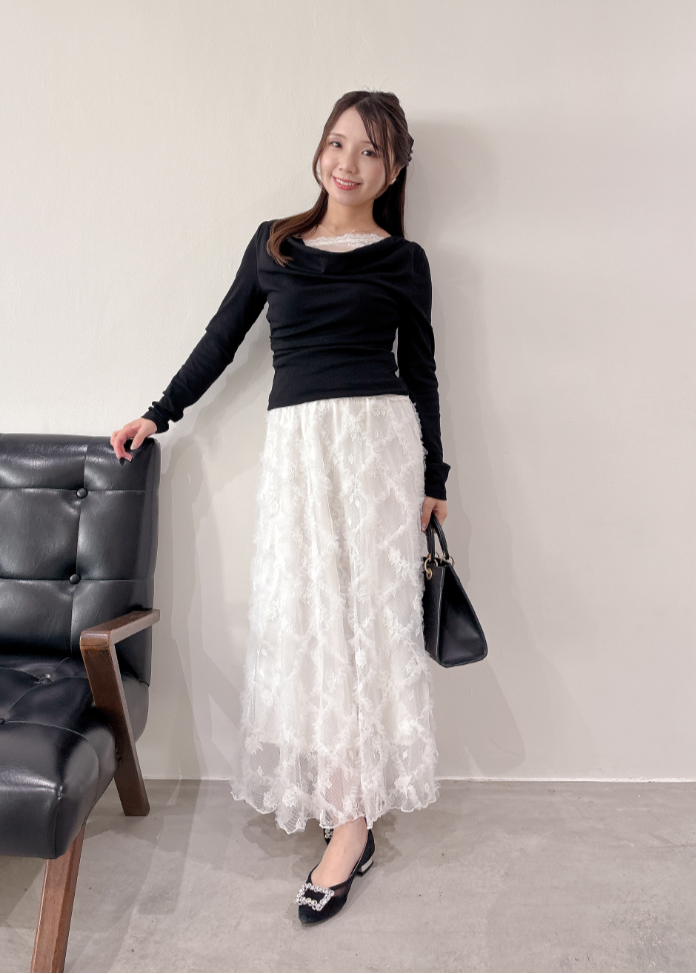 特にレースドレープカットソーのブラックとコーデすると、まるでドッキングワンピースのように着れるのでとてもおすすめです!